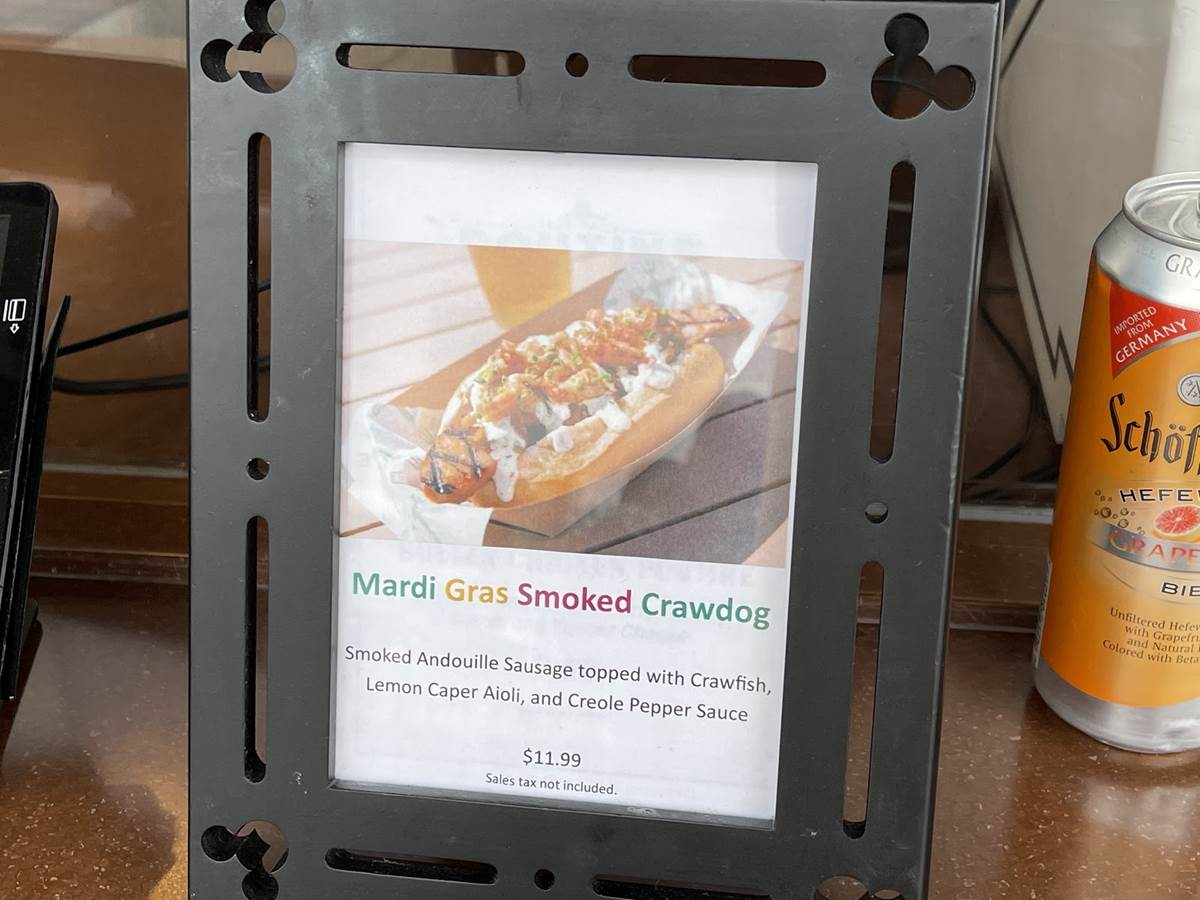 A photo stand over at B.B. Wolf's Sausage Co. is featuring the special Mardi Gras Smoked Crawdog you can now get for $11.99.
