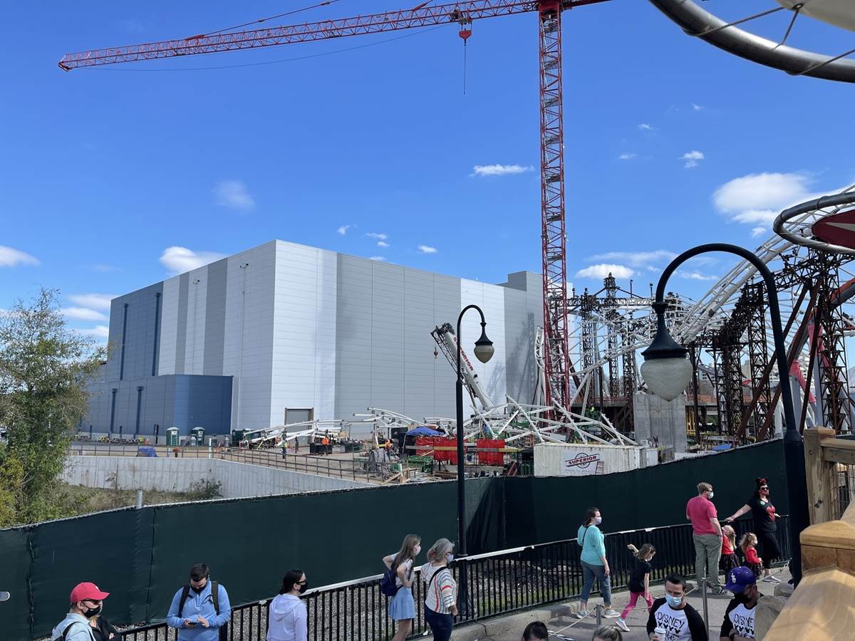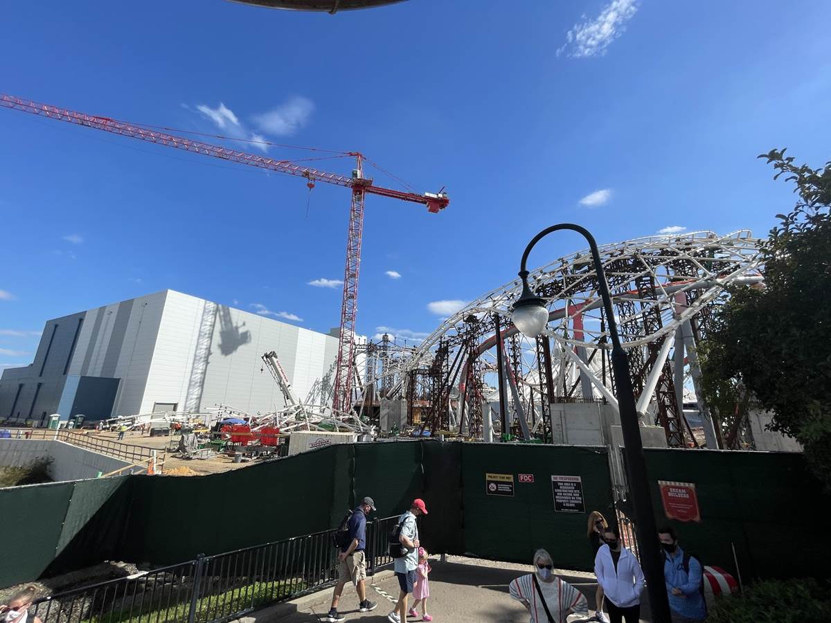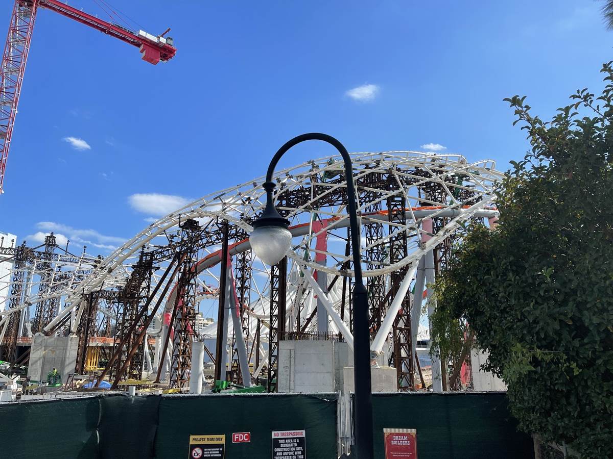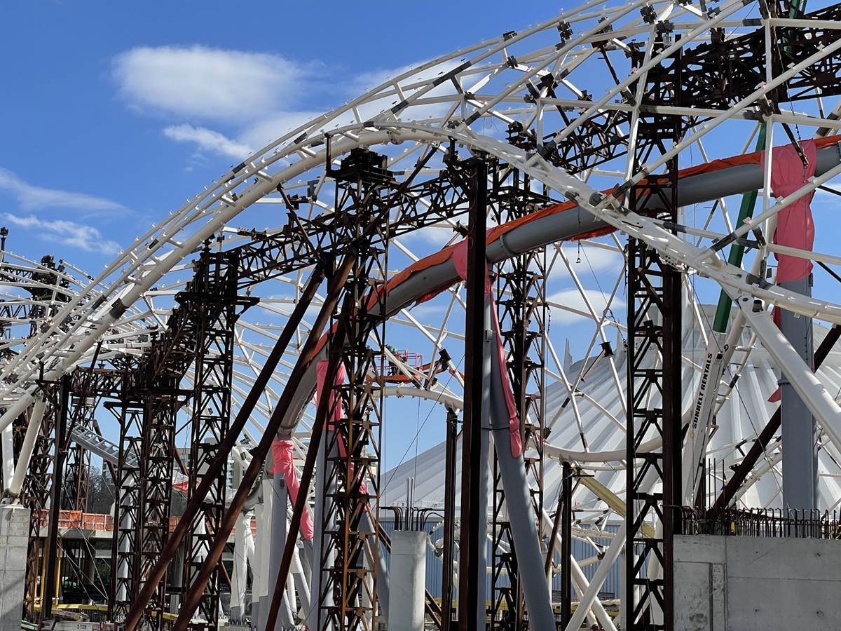 - As we look at the progress from this vantage point you can see that more of the canopy that will cover the exterior track is taking shape. New structure and pylons that almost look like additional coaster tracks are actually for this canopy.