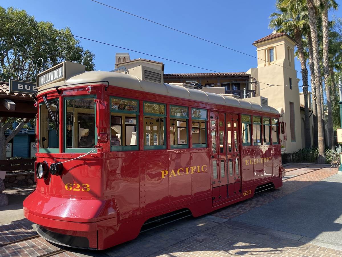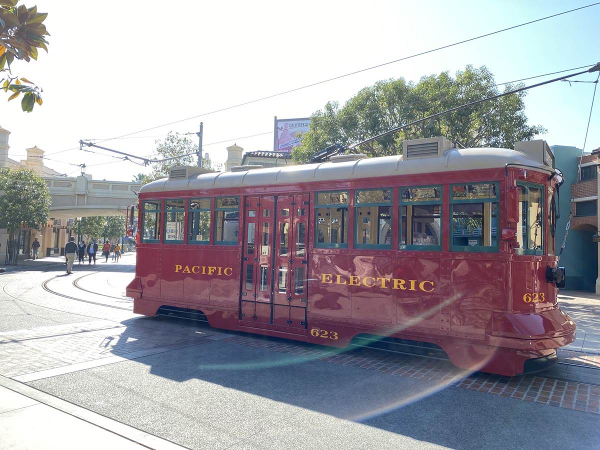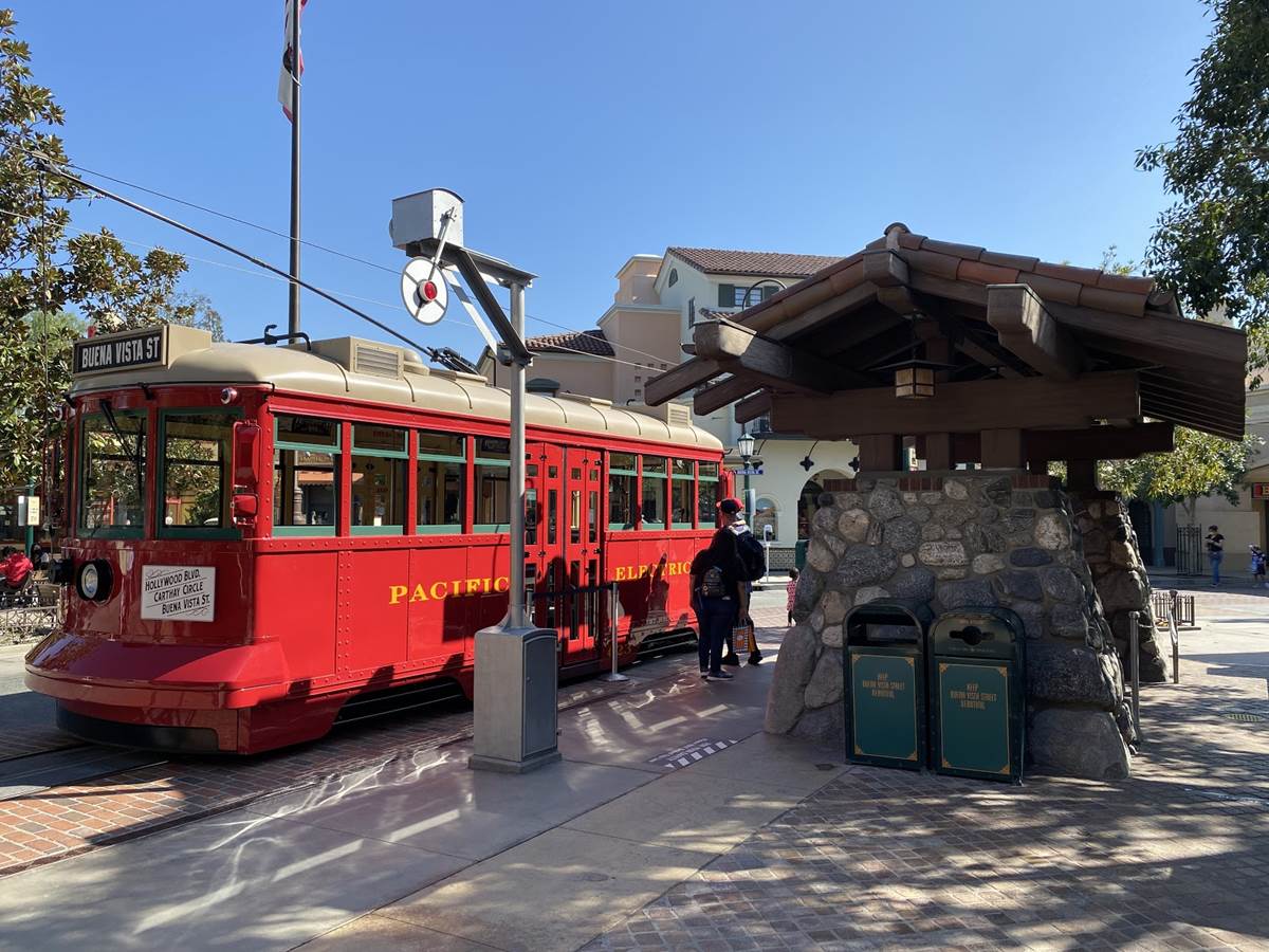 Further down Buena Vista Street near the entrance of the park, we can see that the Red Car Trolley has been relocated out to the stop in front of Oswald’s, allowing for much easier photo opportunities.