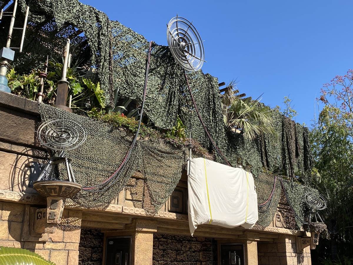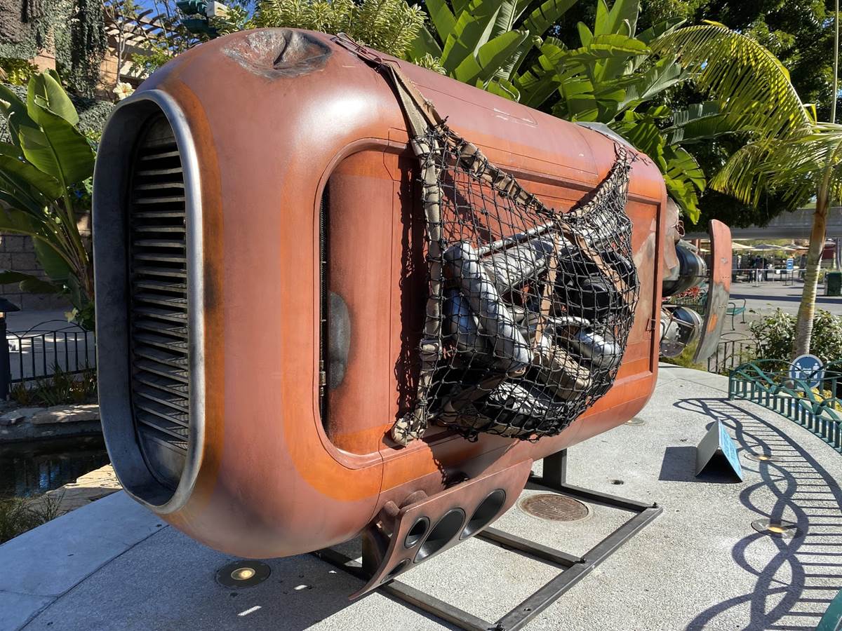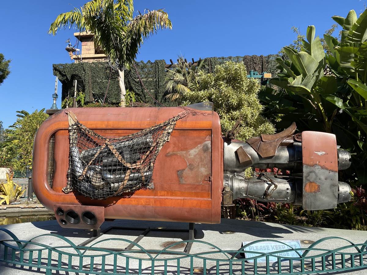 Earlier today, we were at the Downtown Disney District of the Disneyland Resort, and we were able to get a peek on the progress of the Star Wars Trading Post that will be opening soon in the former location of Rainforest Cafe, including the appearance of Rey’s Speeder.