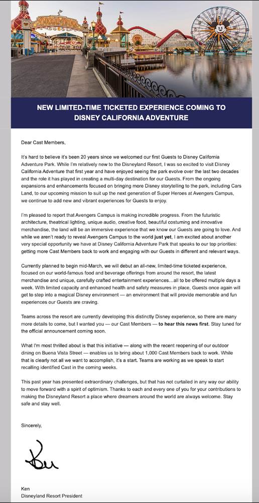 - Cast Members received a letter today from Disneyland President Ken Potrock. The full letter can be read below.
