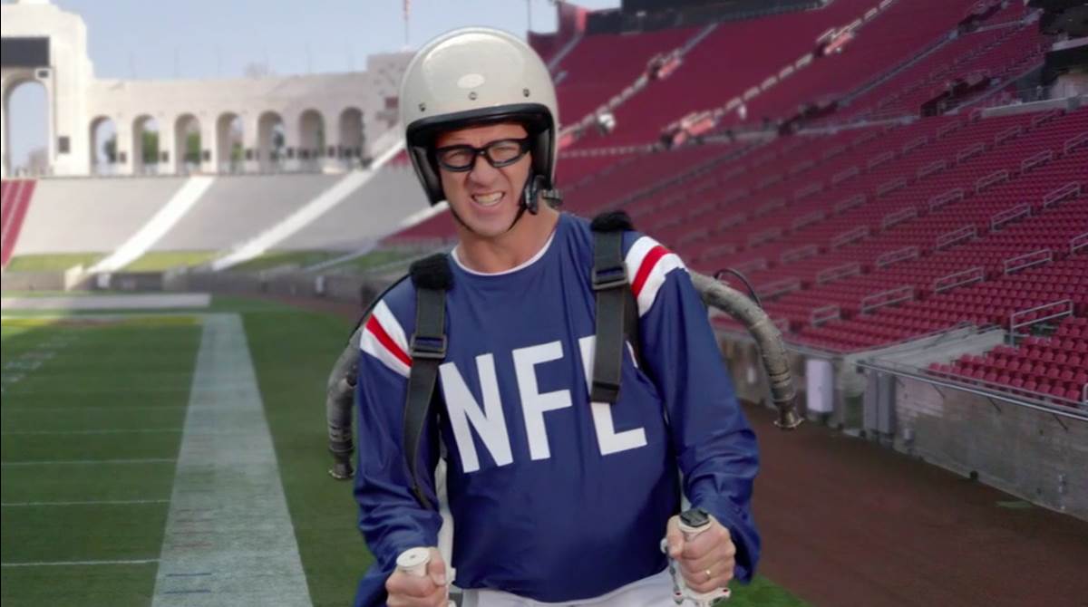 Peyton decides to recreate another moment from that game - the jetpack flight. They dig up the old jetpack from a closet in the coliseum and Peyton suits up to take flight. After Lofton warns Peyton against this stunt, and some really great jokes, Peyton does take flight. And it was totally him and not a stunt double. The hilarious green screen footage they show of Peyton flying around the field is one of the funniest bits this show has ever done.