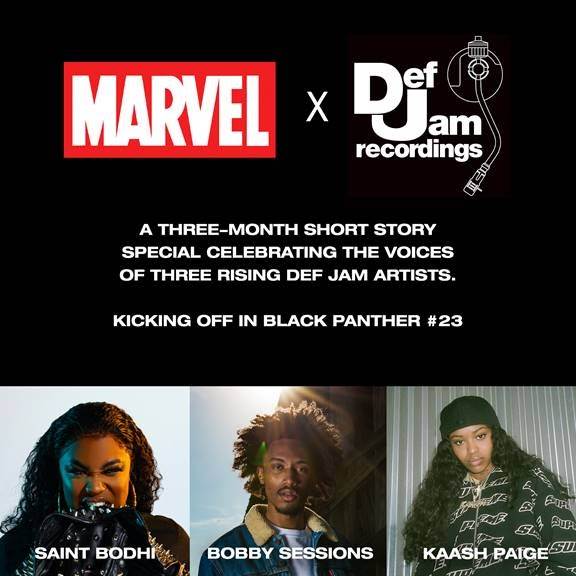 - Three of Def Jam’s rising stars – Saint Bodhi, Bobby Sessions, and Kaash Paige – will each contribute character-driven short stories in Black Panther #23, #24, and #25, the last three issues of the “Intergalactic Empire” saga from the acclaimed creative team featuring writer Ta-Nehisi Coates and artist Daniel Acuna.