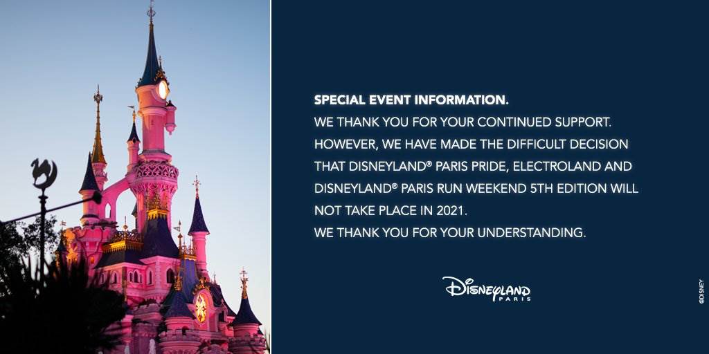 - The social media message reads: “We thank you for your continued support. However, we have made the difficult decision that Disneyland Paris Pride, Electroland, and Disneyland Paris Run Weekend 5th Edition will not take place in 2021. We thank you for your understanding.”