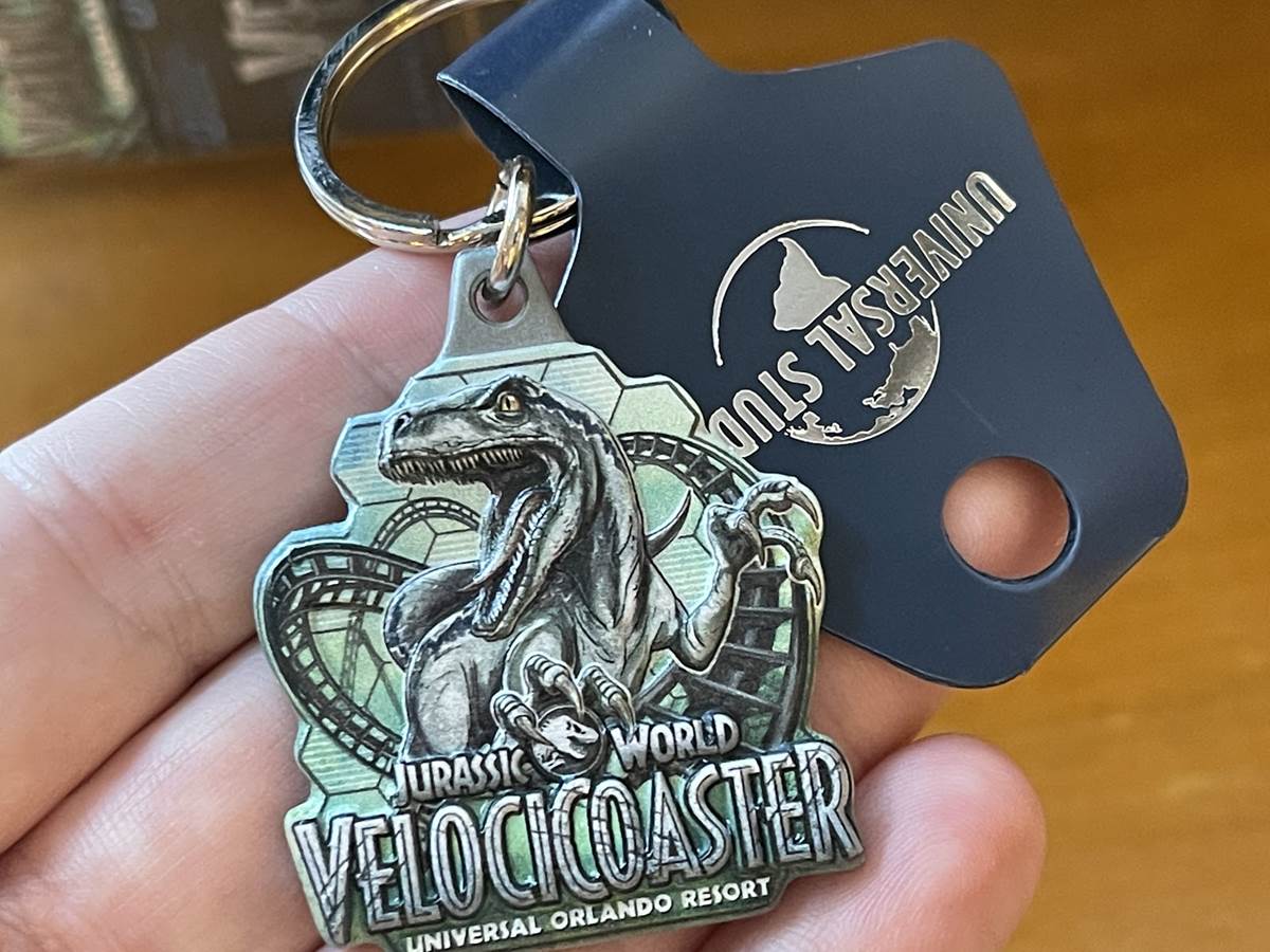 The logo, featuring a Velociraptor entangled in some coaster track, is also carried over into pins, keychains and mugs.