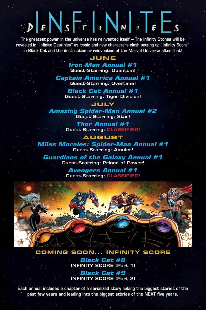 - Stay tuned for announcements about other INFINITE DESTINIES annuals coming in July and August from Marvel’s top talent.