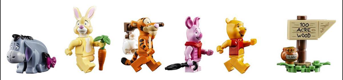 - The 1,265 piece set includes five new characters with their own accessories. Pooh with a red balloon, Piglet with his scarf, Tigger with his sack on a stick, Rabbit with carrots, and Eeyore with his tail and removable ribbon.