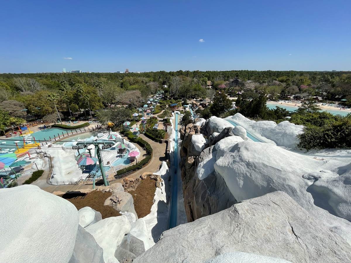 You’ll notice in the pictures that there are few people here. The weather today in Orlando, while quite pleasant, is a bit on the cool side. The temperatures range in the low 60s which for many sounds like a great day, but for those getting out of the water of a lazy river, wave pool, or splashing down after a slide, feels drastically different and uncomfortable making for a not-so-pleasant day. In fact, Universal’s Volcano Bay which also recently reopened, closed for the weekend based on the forecast. The marketing for the reopening of Blizzard Beach is also lackluster, especially when compared to other efforts of Walt Disney World, and even other area parks, so word might not be out yet that “the only ski resort on the meltdown” is open once again.