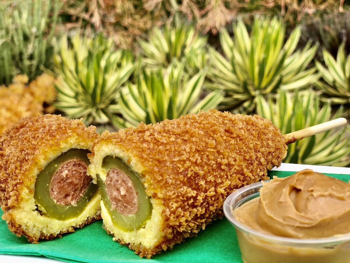 The Dill Pickle Corn Dog with a side of peanut butter at Blue Ribbon Corn Dogs.