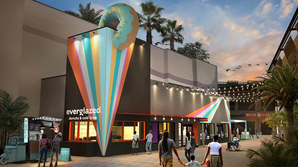 - Everglazed Donuts & Cold Brew is located in the West Side area of Disney Springs, taking over the former Pop! Gallery location adjacent to Splitsville and the AMC Theaters and near the west entrance and exit of the Orange Parking Garage.