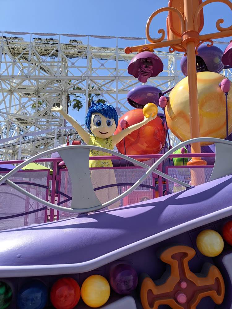 Characters are also popping up all around the park. We were able to spot Joy playing with a core memory (we know it’s a core memory, we asked!) at the Inside Out Emotional Whirlwind.