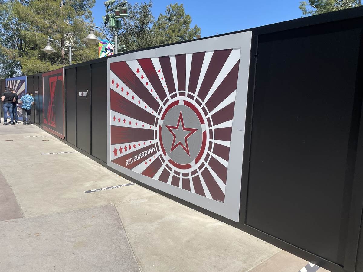 Avengers Campus, the next big land coming to Disney California Adventure is arriving soon, but not just yet. We can get a small glimpse near the D-Lish cart of the event, and the construction walls in the area are covered with billboards promoting the upcoming Black Widow.
