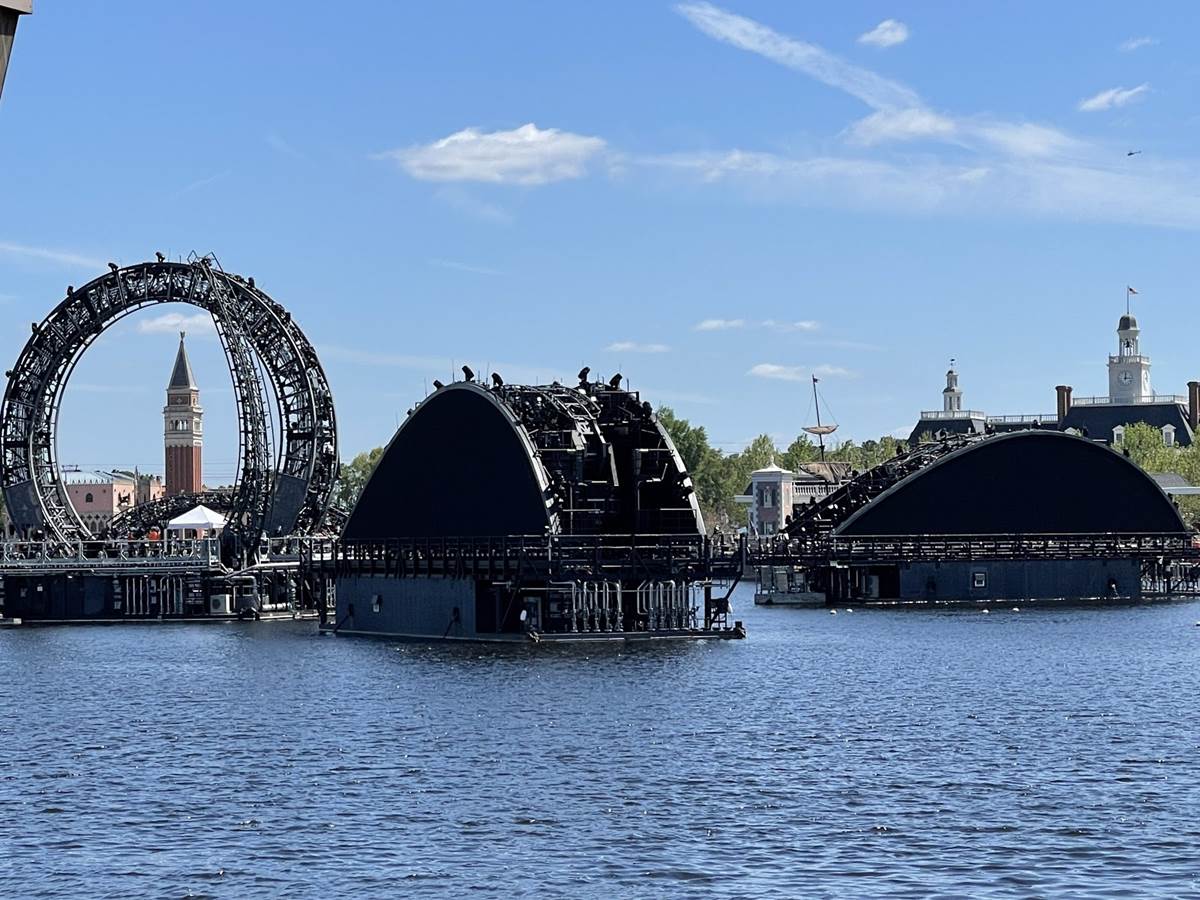 The Third of the Four “Harmonius” Barges Makes Its Way to World Showcase Lagoon at EPCOT