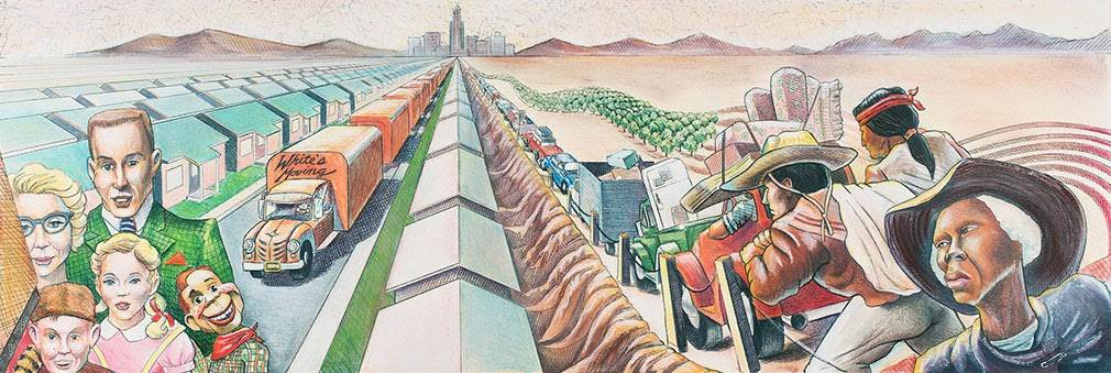- The mural depicts well-known historical narratives as well as often-overlooked events such as the displacement of Indigenous communities, the internment of Japanese American citizens, and the expulsion of Mexican Americans from Chavez Ravine.