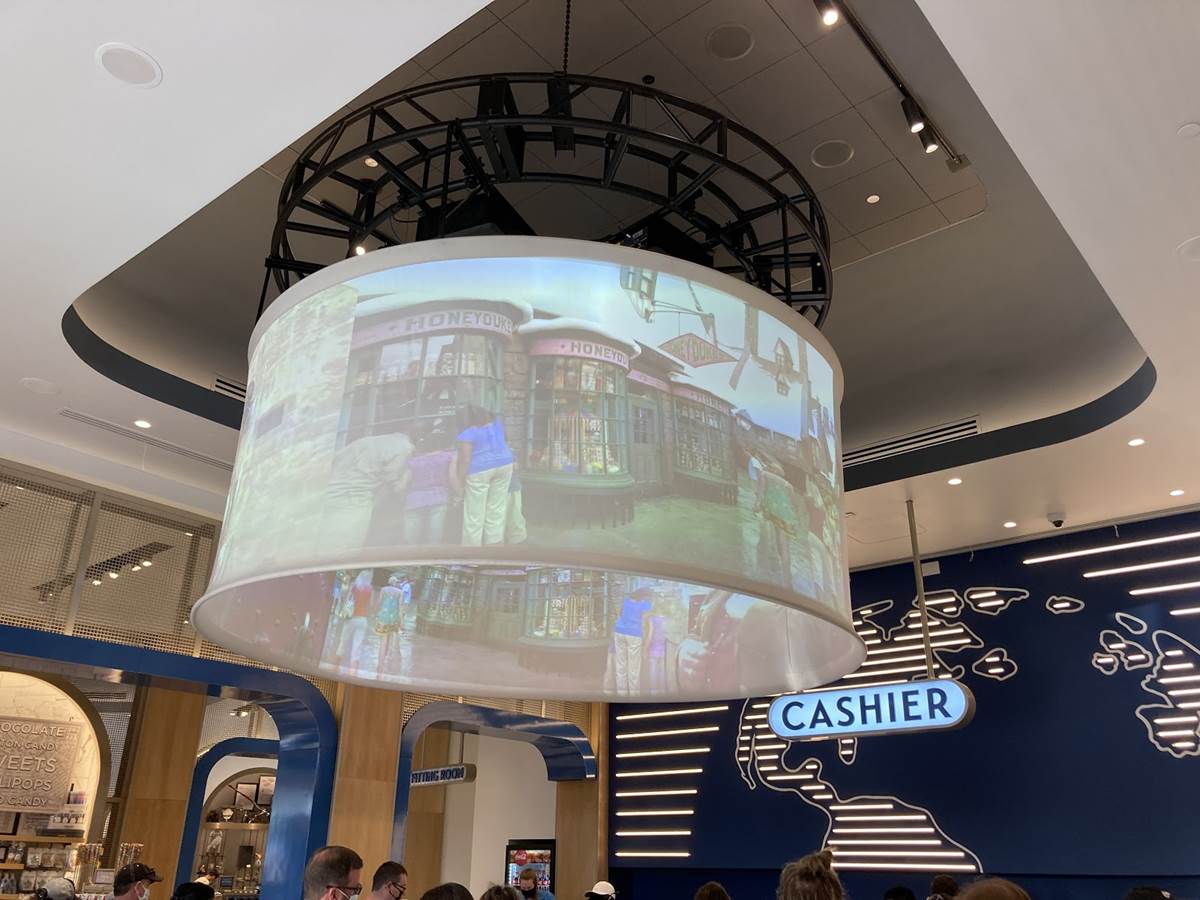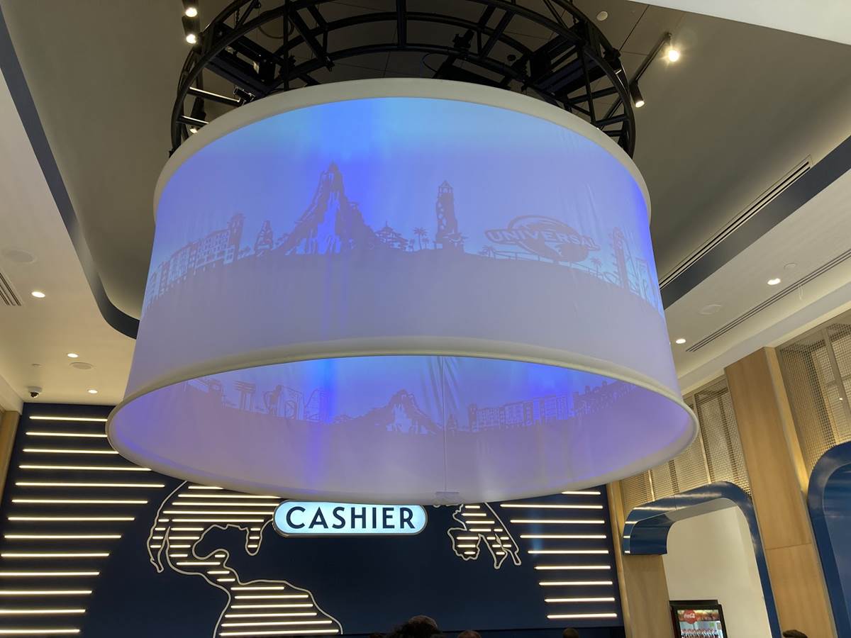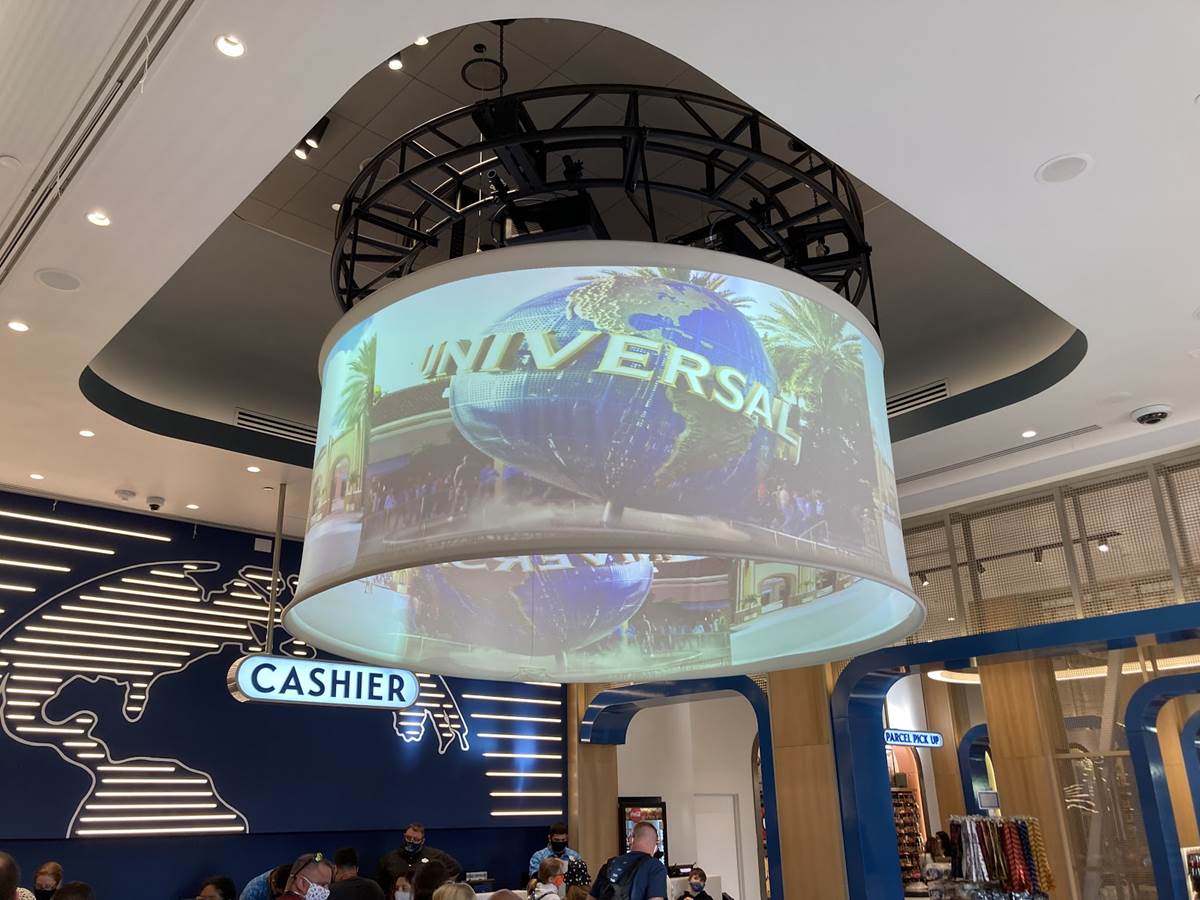 New pieces hanging from the roof serve as screens where footage of park attractions, iconography, and landmarks, such as the trademark Universal Globe, is projected onto the curvature for guests waiting in line to checkout at the cashier stand to enjoy.