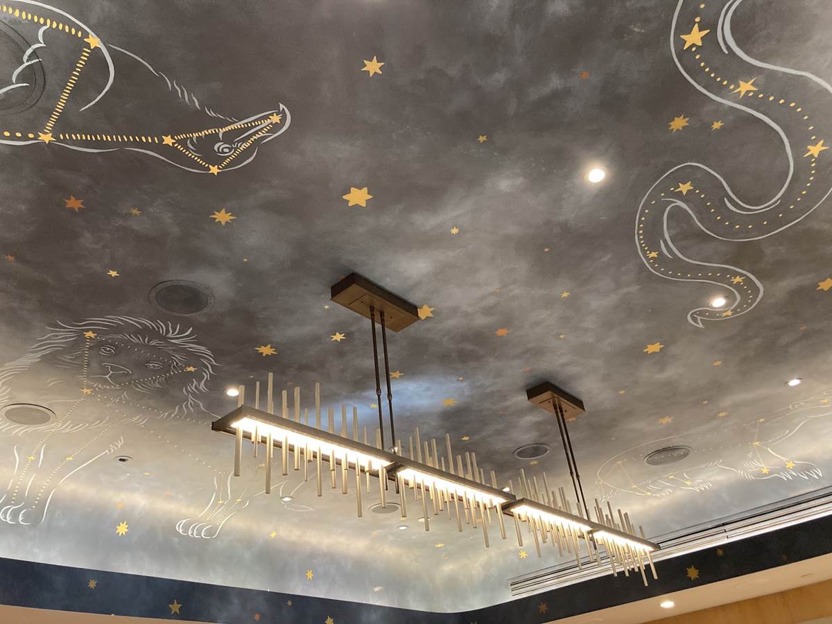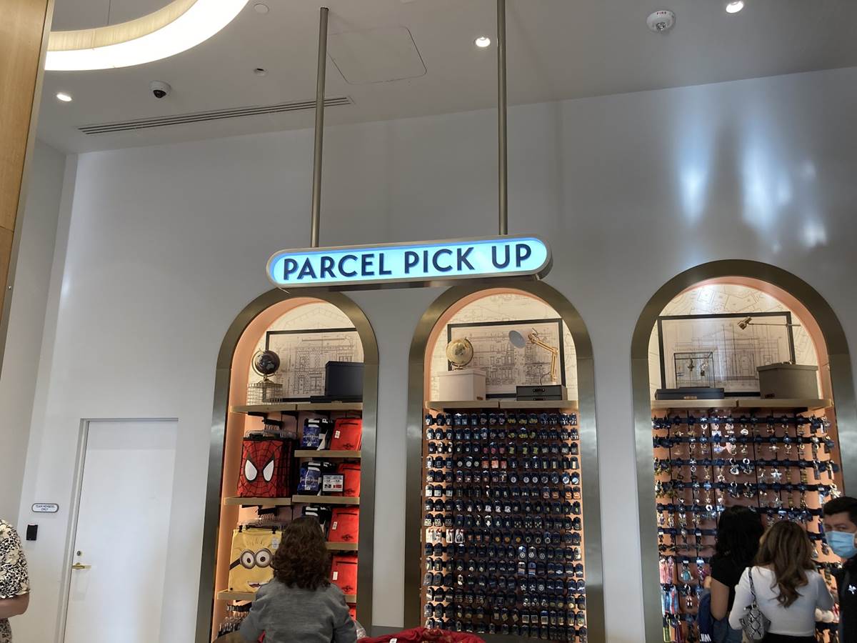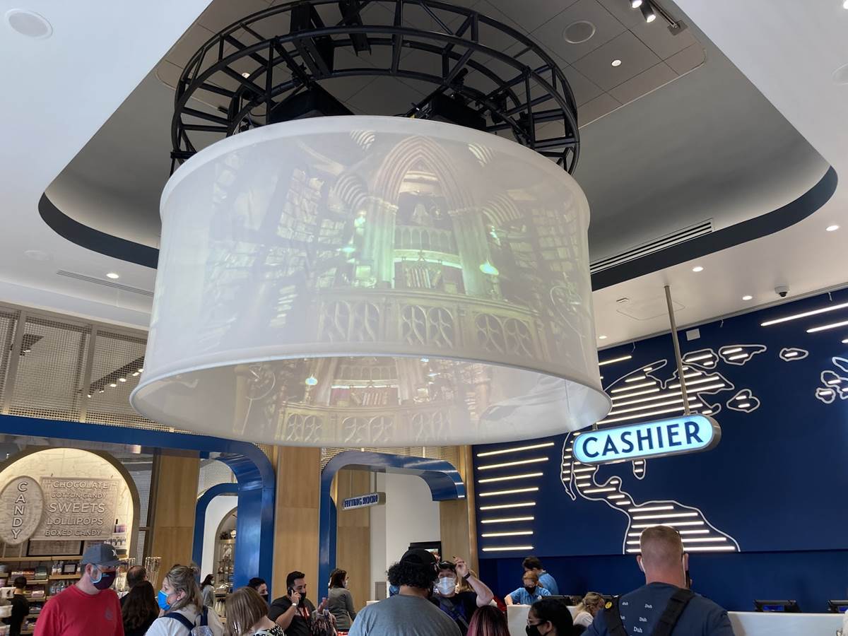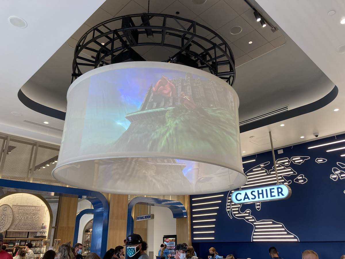 New pieces hanging from the roof serve as screens where footage of park attractions, iconography, and landmarks, such as the trademark Universal Globe, is projected onto the curvature for guests waiting in line to checkout at the cashier stand to enjoy.