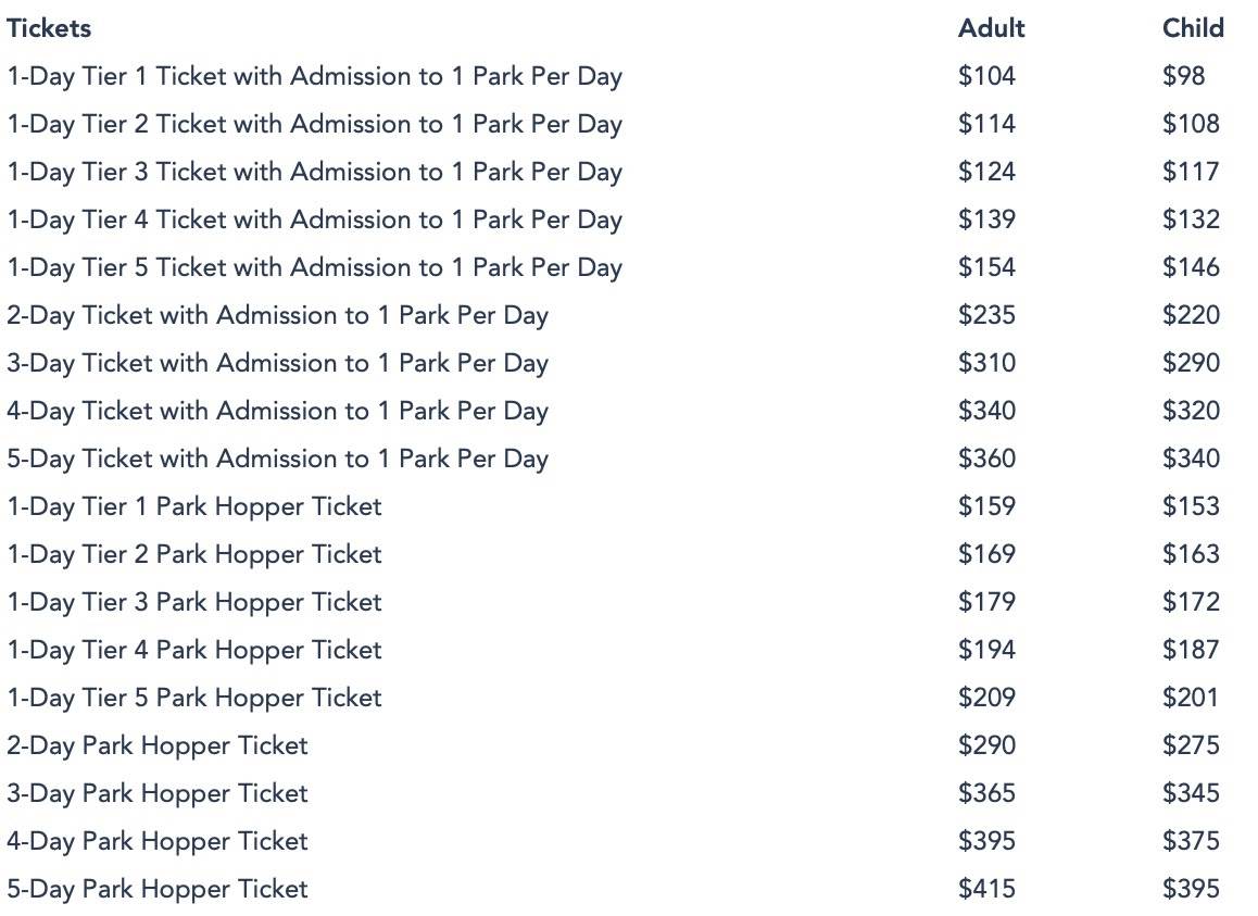 - 1-Day Tier 5 Park Hopper Ticket - Adult ($209) Child ($201)