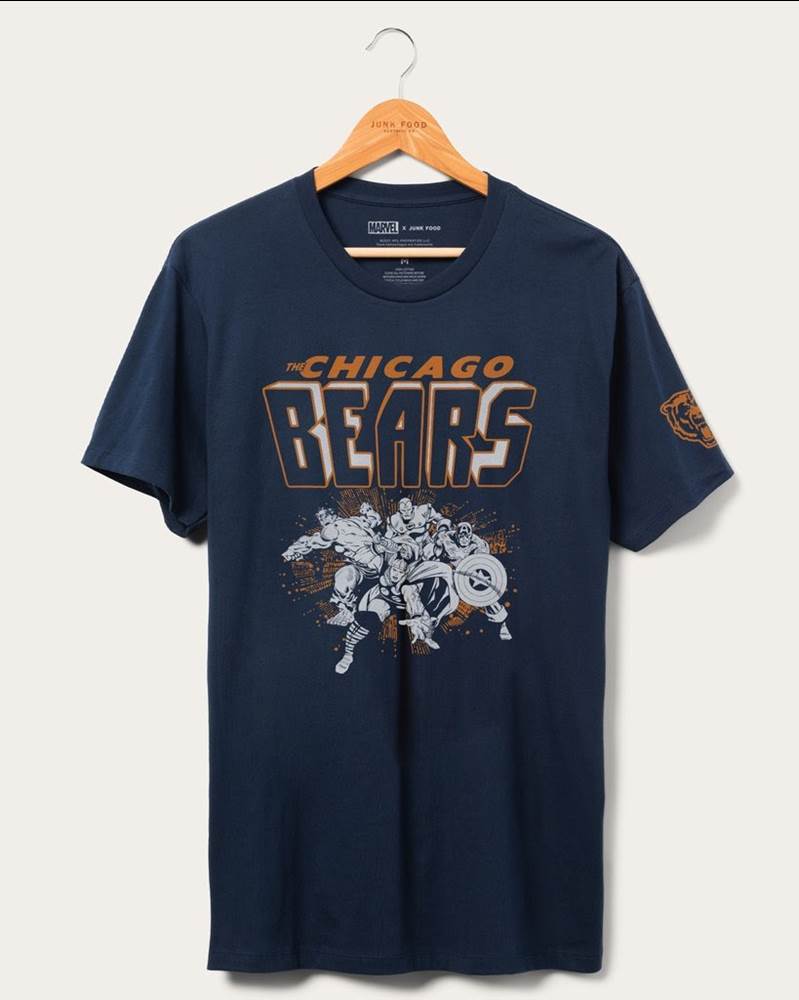 - "The Avengers Throwback" Tee - 1970s-era comic book character art of Captain America, Iron Man, Thor and The Hulk accompanies NFL team names in the iconic slanted font.