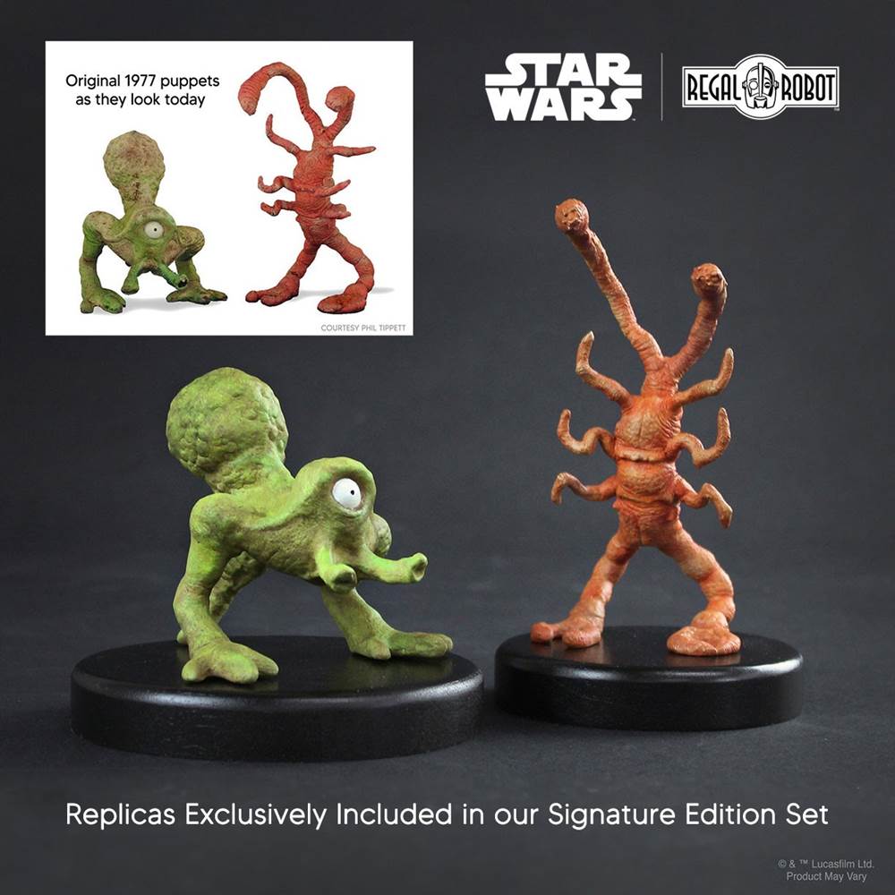 - Regal Robot: “We’re excited to share a first look at our amazing prop replicas that will be available on May the 4th! The hand-painted, static resin replicas in our Dejarik sets are 1:1 scale to the actual puppets used in filming the stop-motion chess sequences in the Star Wars Saga and with lineage to those original puppets! Our replicas were prototyped using the digital files that Phil Tippett’s team created in 2015, when they used 3D scanning and photogrammetry of original props used in Star Wars: A New Hope to accurately recreate the wildly imaginative creatures he and Jon Berg hand-sculpted in 1977.”