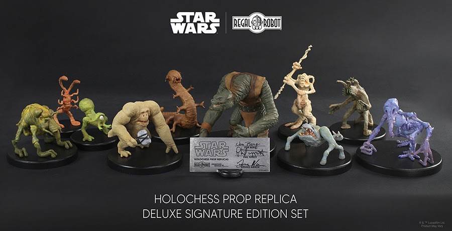 Now, thanks to our friends at the themed collectible company Regal Robot, Star Wars fans will have the opportunity to own a highly detailed deluxe replica set of the Holochess pieces copied directly from Lucasfilm and Industrial Light & Magic’s digital scans of the pieces, including two rare “lost” creatures, with a plaque signed by three of their creators.