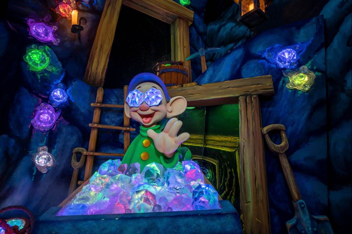 - The dazzling mine scene sparkles with shimmering lighting effects and glittering jewels. Guests can be on the lookout for Doc examining a jewel, Grumpy hoisting a pick, and Dopey grinning from a jewel-filled mine cart.