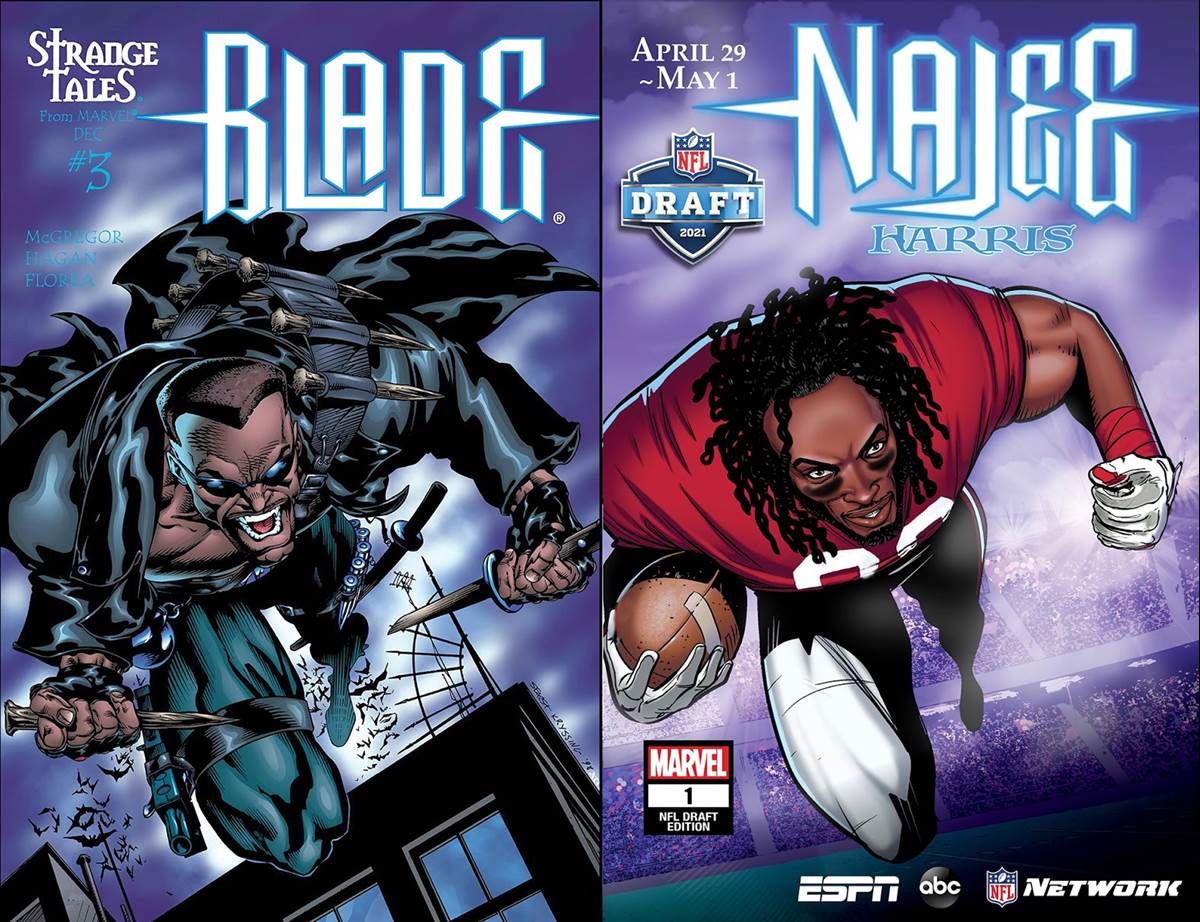 “Najee Harris (Alabama), an elite running back with a rare combination of power, quickness and speed, is ruthlessly efficient on the football field. Whether he is running over defenders, zooming past them or cutting his way through NFL defenses, he is a force to be reckoned with… much like the Marvel’s “Day Walker,” BLADE, who uses his own brand of power, speed and super human abilities to battle the evil forces of the night. Credit: Ray Anthony Height (artist), Wil Quintana (colorist); Strange Tales: Blade #3, after Bart Sears.”