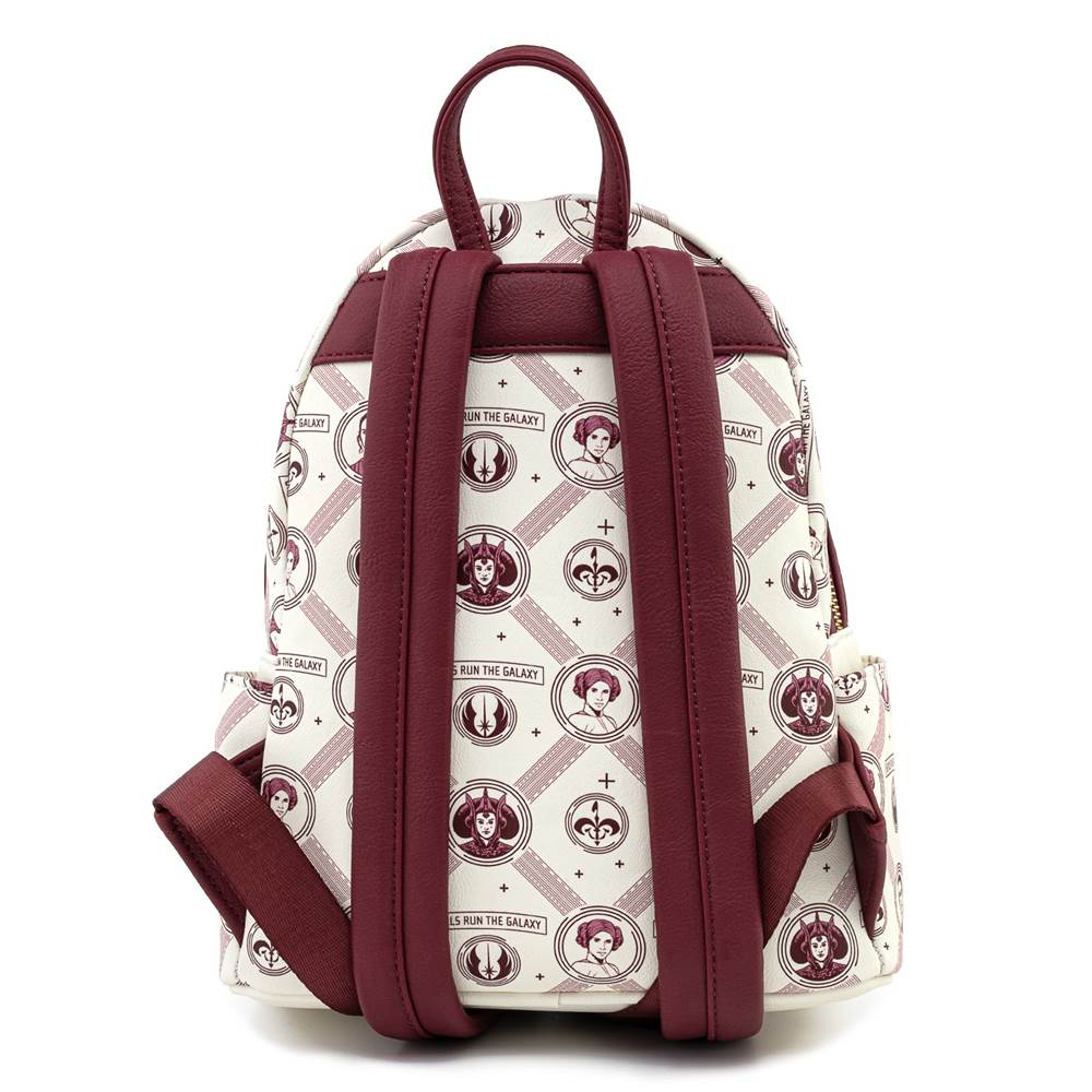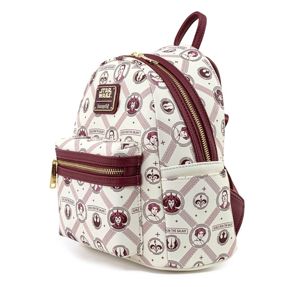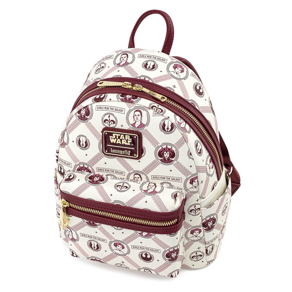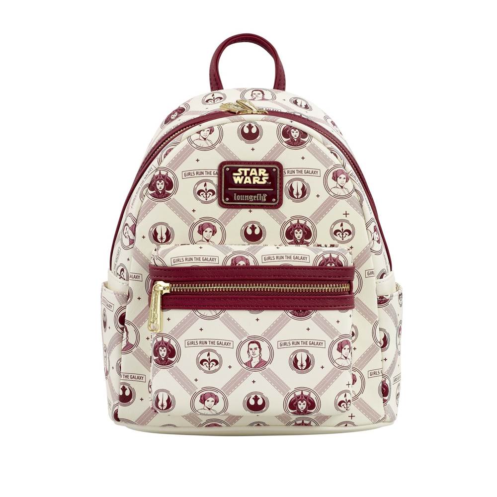 “Who runs the galaxy? GIRLS! This Loungefly backpack pays homage to some of the most powerful women from the Star Wars universe, and who doesn’t want to carry around the strength and intelligence that these women represent? No wars here, just stars! Made from premium faux saffiano leather and features printed and debossed details.”