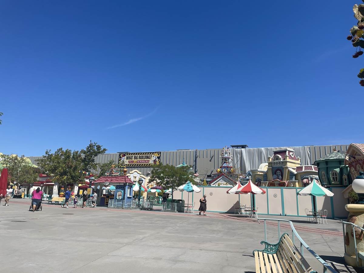 Over the last year, the skyline of Mickey’s Toontown at Disneyland Park has been drastically altered (temporarily!) as the show building for Mickey and Minnie’s Runaway Railway takes shape, with a large, hilarious banner telling us not to believe our own eyes!
