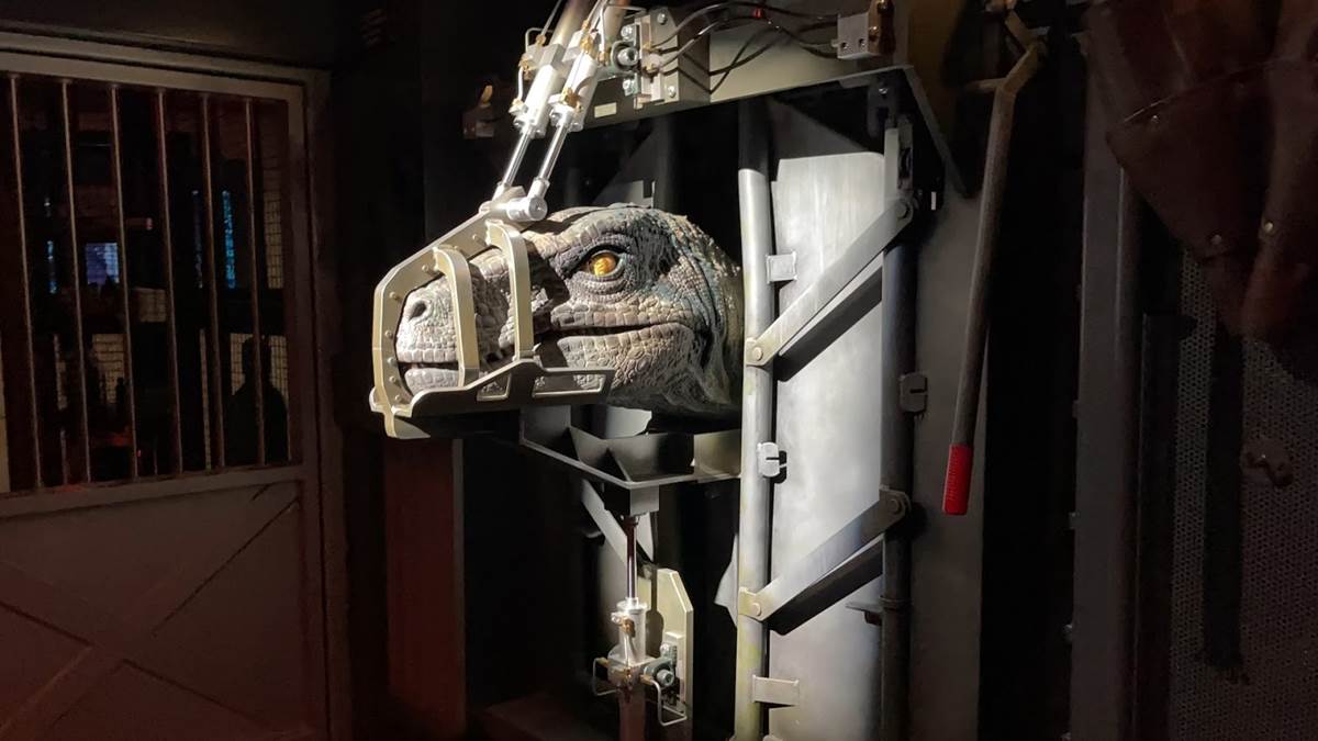 The queue features muzzled velociraptors that are clearly alive, blinking, snorting, and trying to break free of their restraints. There are also easter eggs hidden throughout, with books by both Dr. Ian Malcolm and Dr. Alan Grant featured in displays.