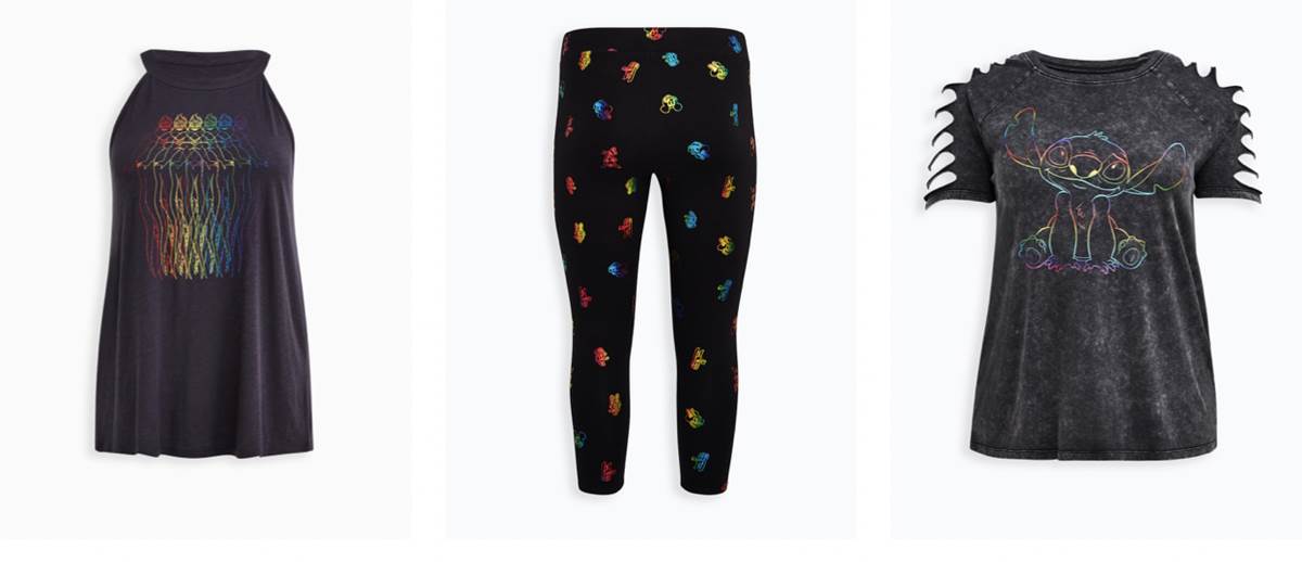 At Torrid starting May 25, you’ll be able to find a Ursula Rainbow Hi Neck Tank, Mickey & Friends Rainbow Crop Leggings, and Stitch Rainbow Slash Top.