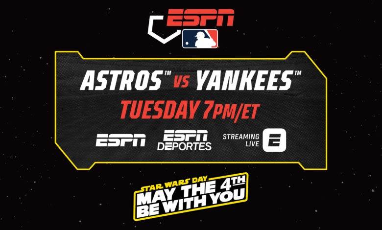 - ESPN’s Major League Baseball coverage for the week ahead will feature a Star Wars-themed telecast on Tuesday, May 4, when the New York Yankees host the Houston Astros at 7:30 pm ET.
