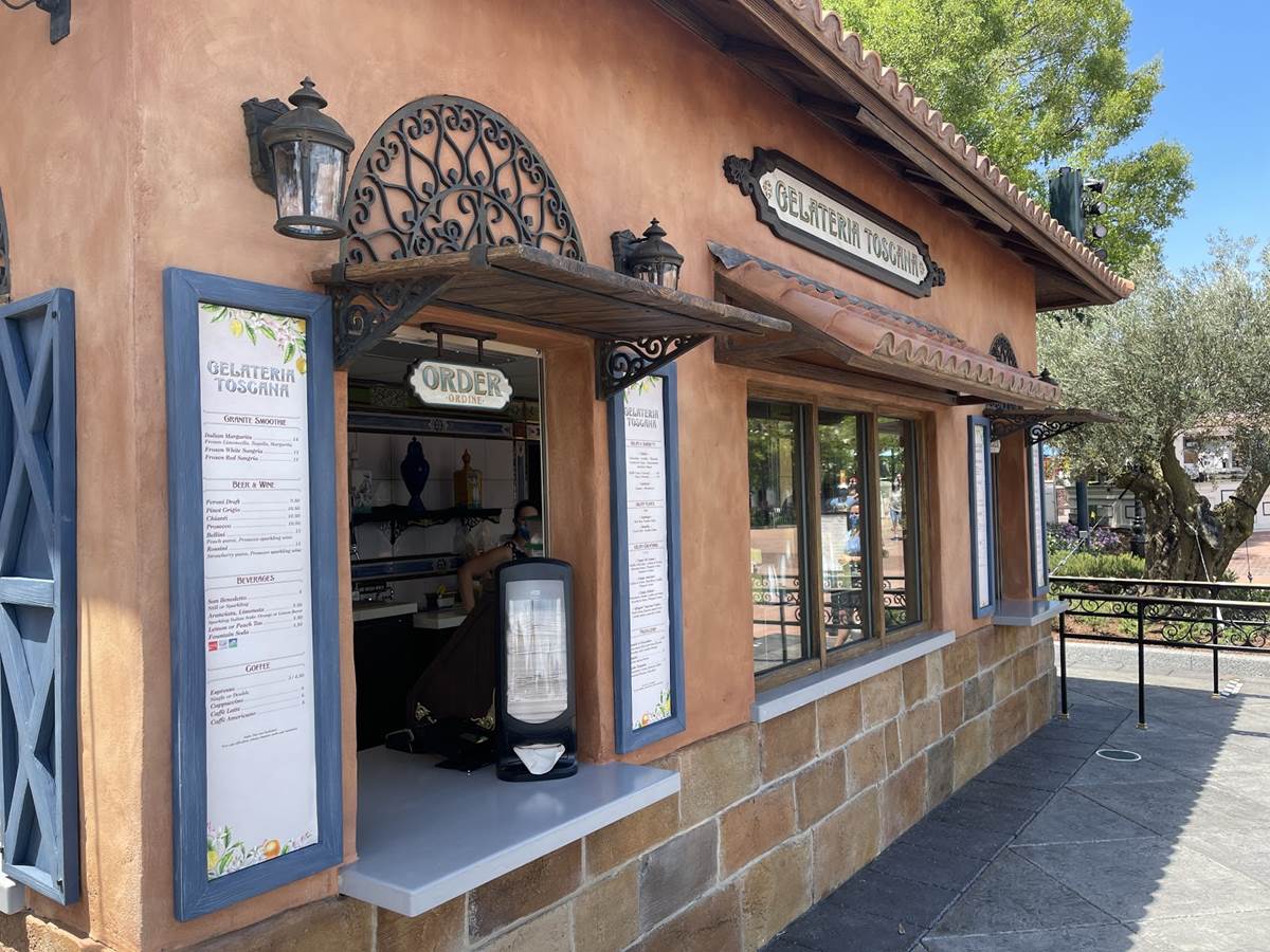 Located in EPCOT’s Italy pavilion in World Showcase, Gelateria Toscana features walk-up windows in which to order your delicious treats and beverages. To give park fans an idea of where the new gelateria is, the new offering takes the place of a cart that was used as one of the starting points of the former Kim Possible World Showcase Adventure, with the cart standing dormant in its later years before making way for the delectable Italian desserts and drinks.