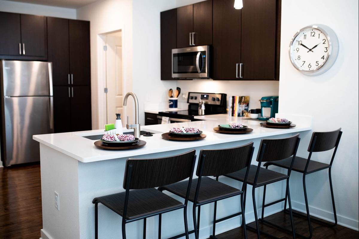 - They all feature hardwood-style floors, a washer and dryer, a smart TV, and furniture including beds, couches, tables, chairs, and more. The kitchen comes with plates, utensils, cookware, and glassware.
