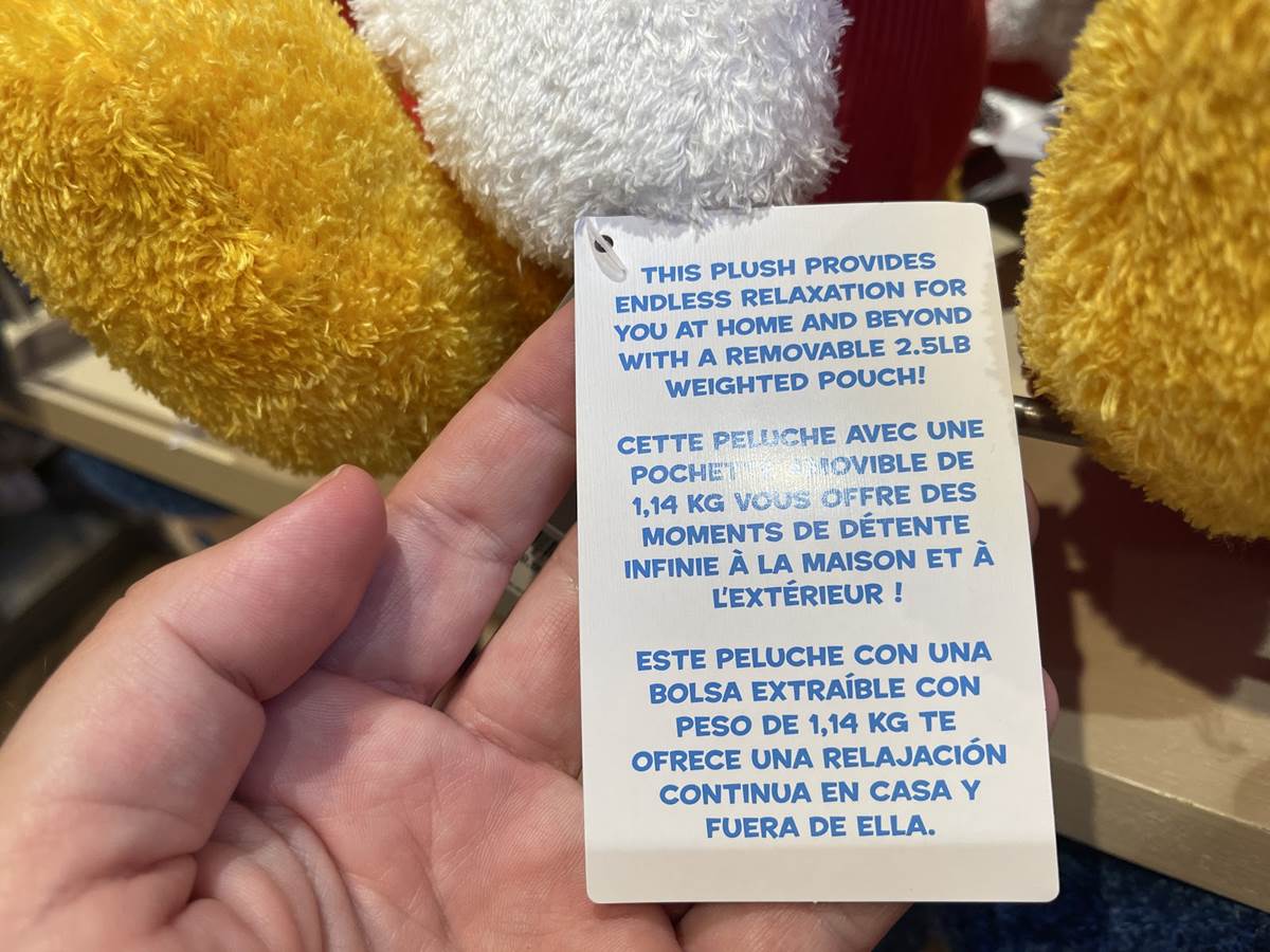 A new series of weighted plush toys were spotted today at World of Disney at Disney Springs in Walt Disney World. These plush are designed to provide endless relaxation for you at home and beyond with a removable 2.5 LB Weighted pouch.