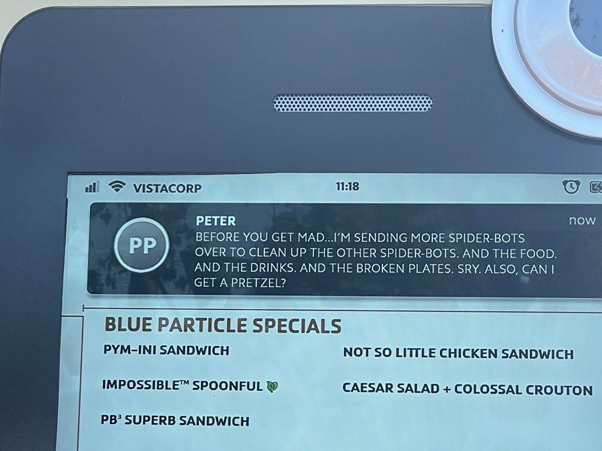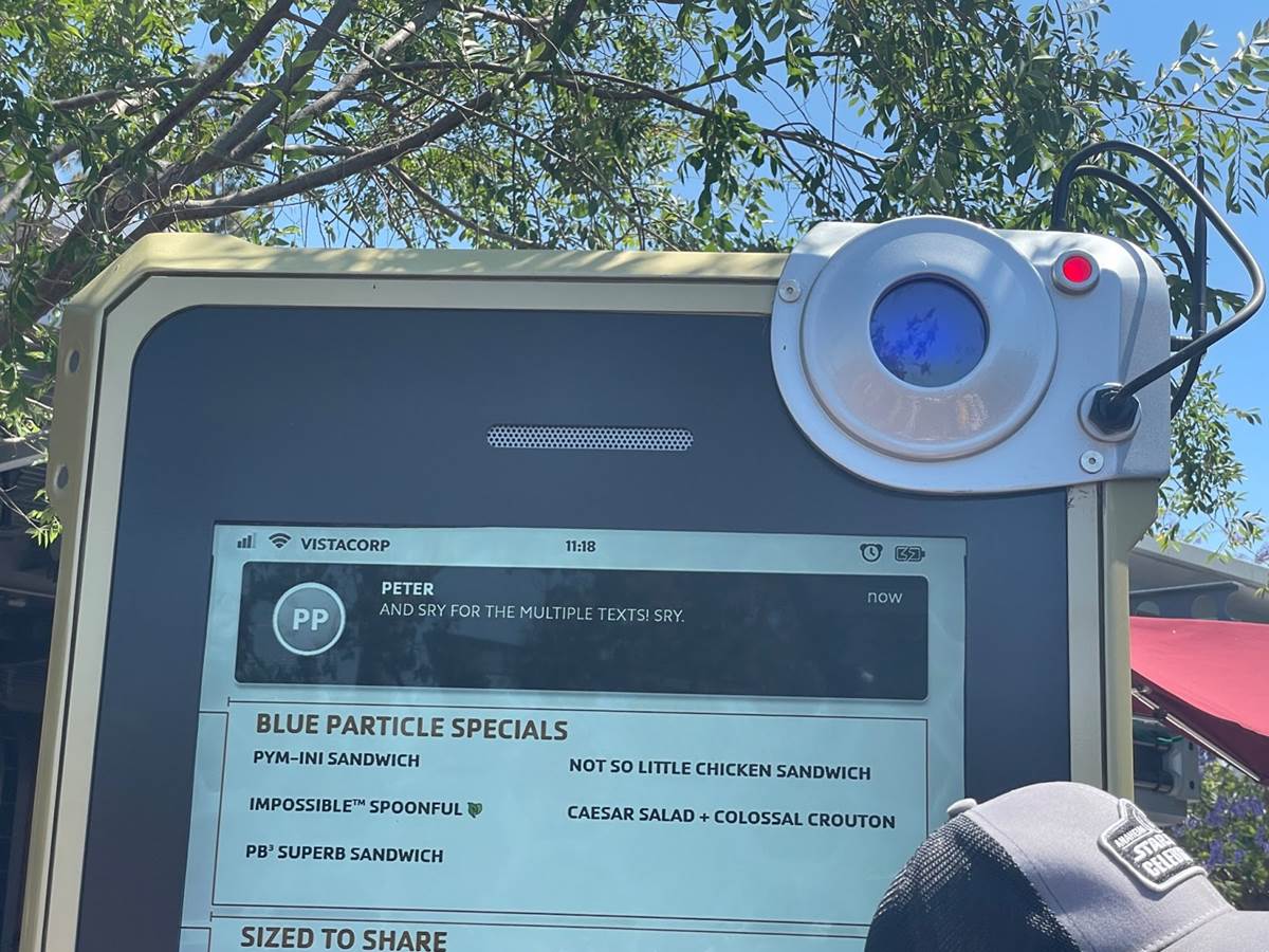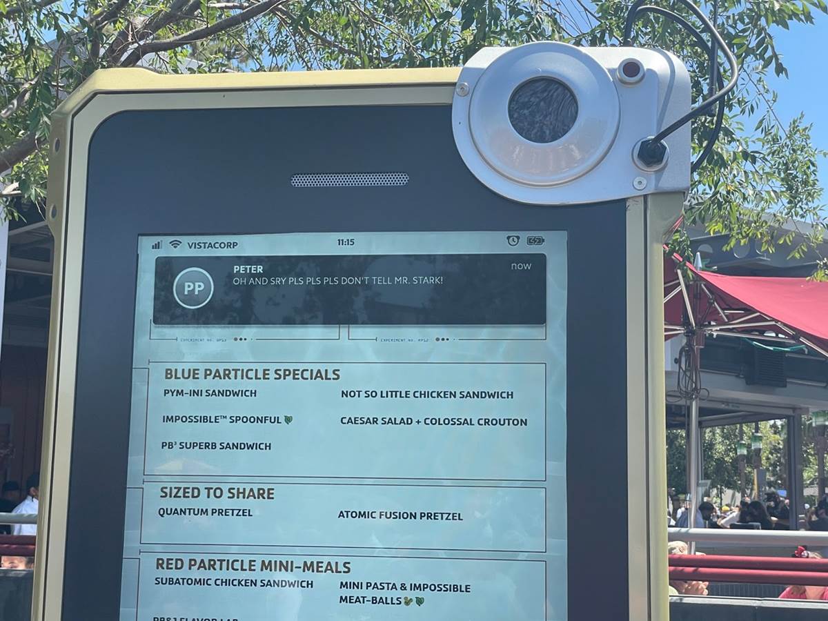 Near Pym Test Kitchen and the Pym Tasting Lab, you’ll see a digital menu board showing you all the offerings available via a giant smartphone, but you’ll also notice that smartphone receiving some notifications from Marvel characters.