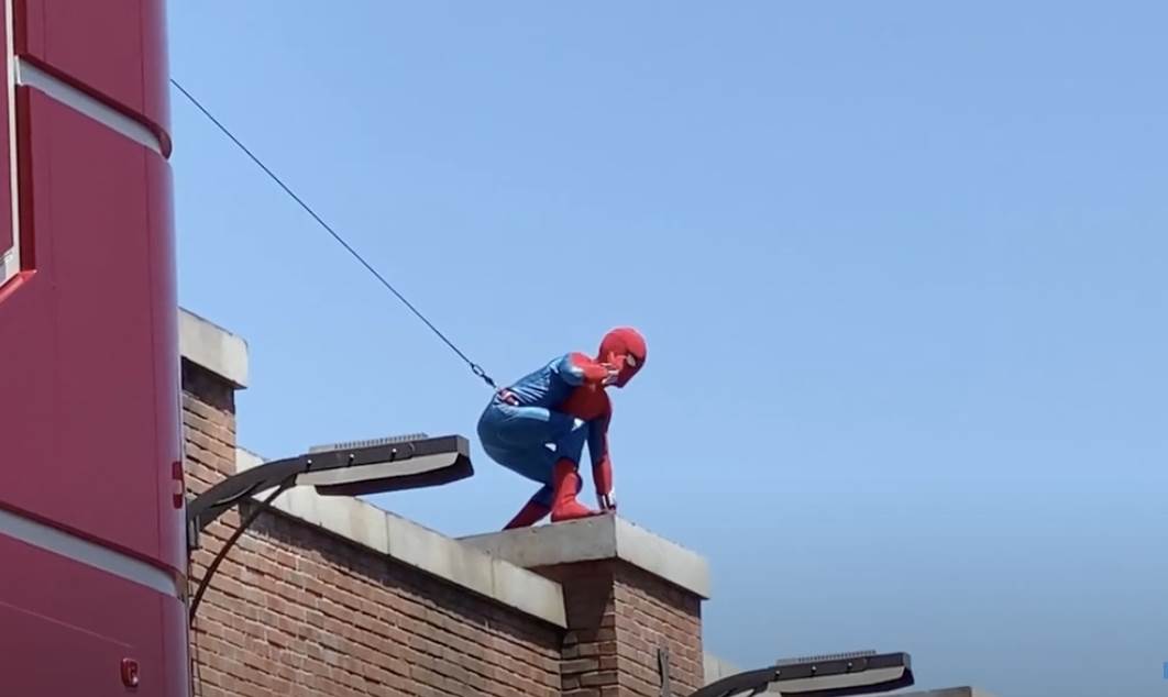 Starting off the show, Spider-Man warms up with some stunts on a few boxes in front of Guests, before his epic stunt soaring through the skies as he tests out some new tech.