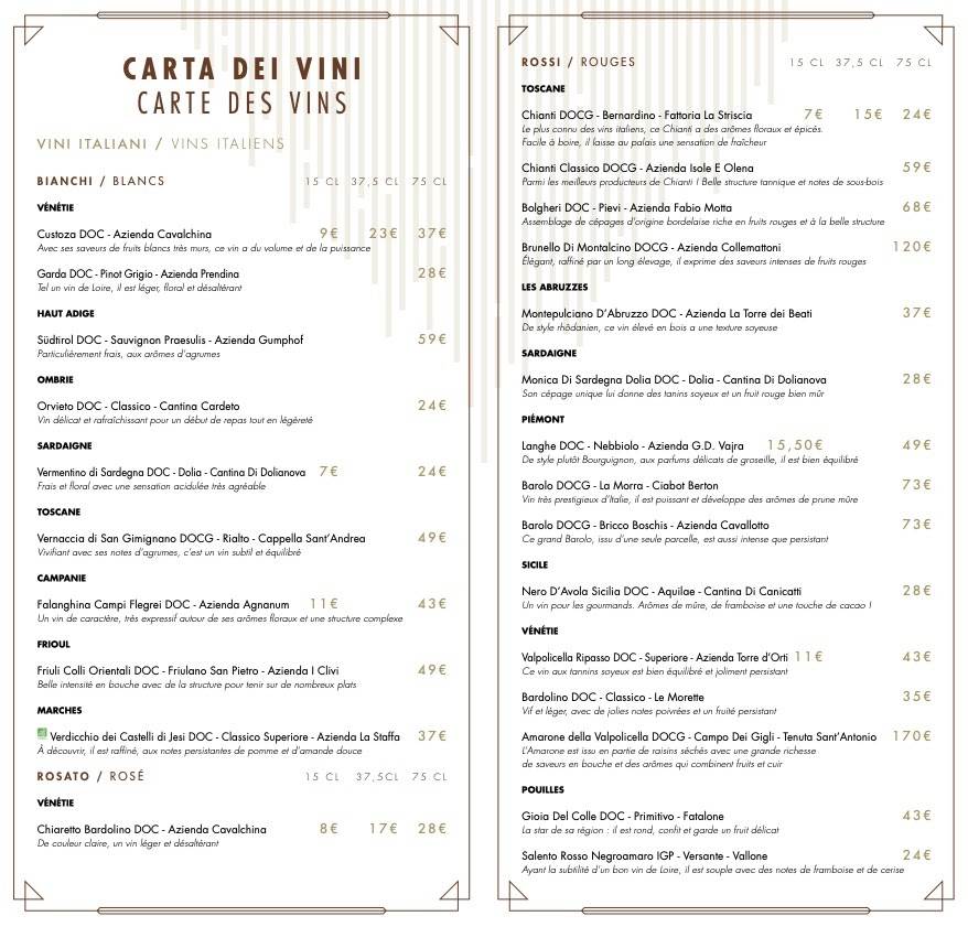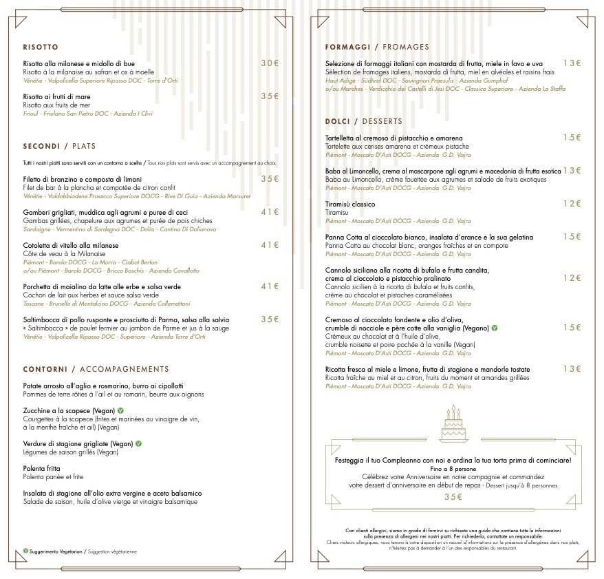 - Desserts include Tiramisu, Panna Cotta, and more.