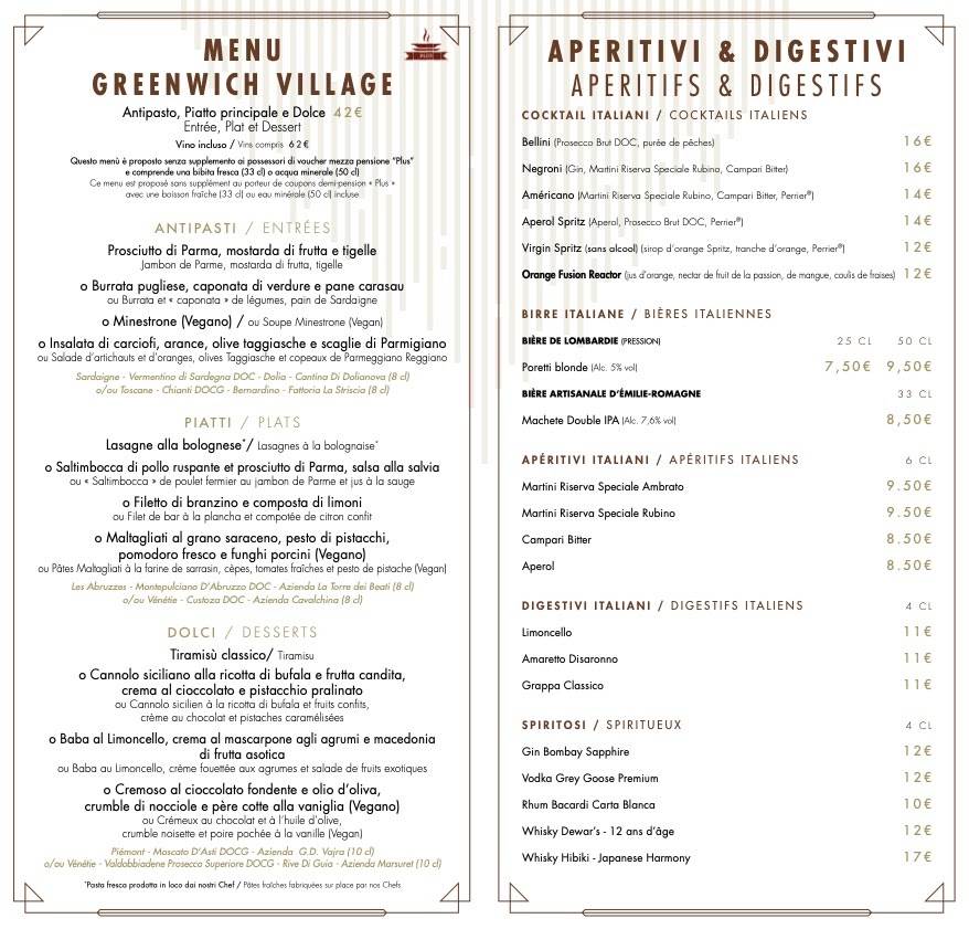 - There is also a prix fixe menu called the Greenwich Village, which includes an appetizer, entrée, and dessert for 42€ ($51 estimated).