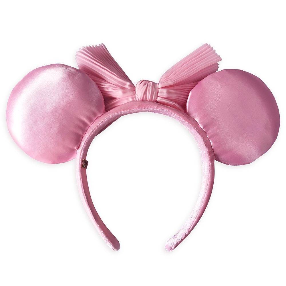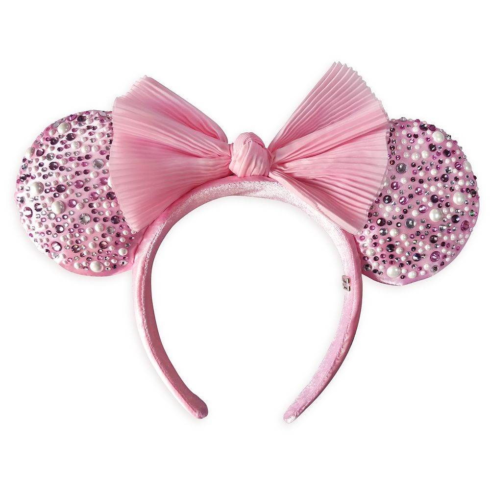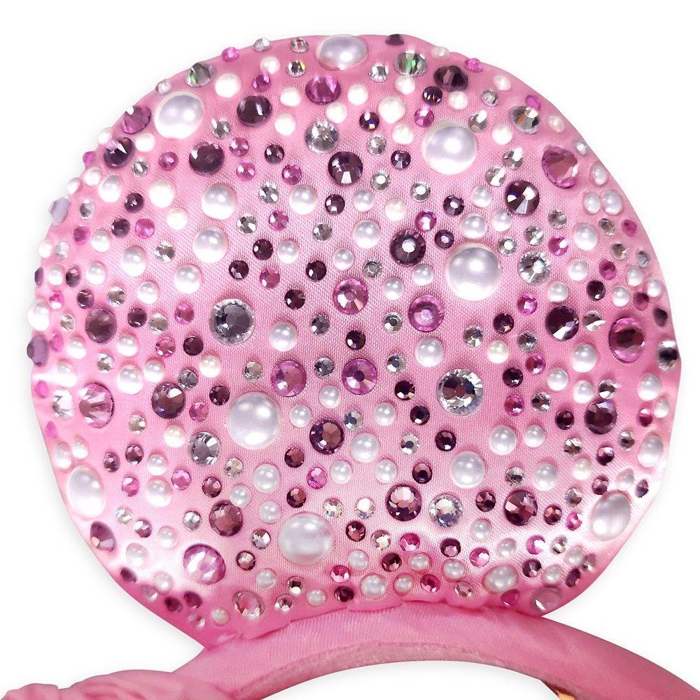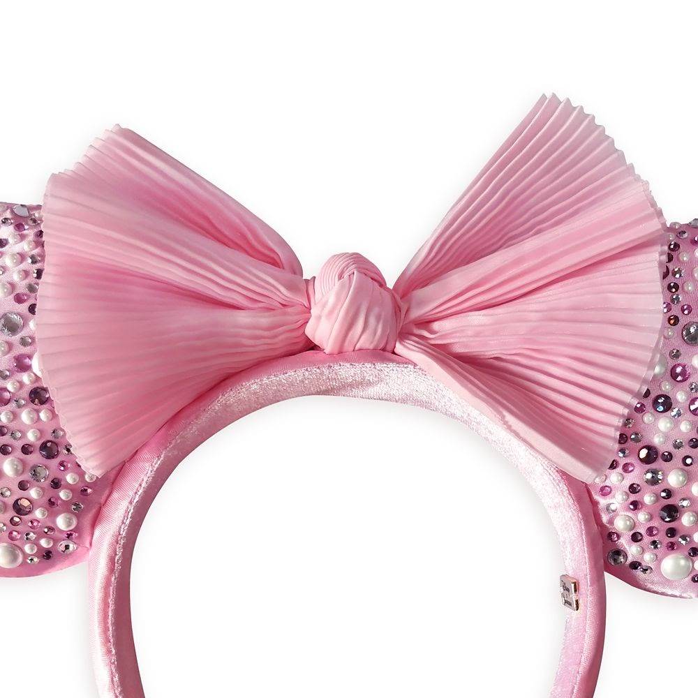 - The Ears are covered in a pretty pink fabric that’s reminiscent of ballet slippers and tutus. They’re dotted with round gems in various sizes and colors including pearl, silver, dark pink and light pink.