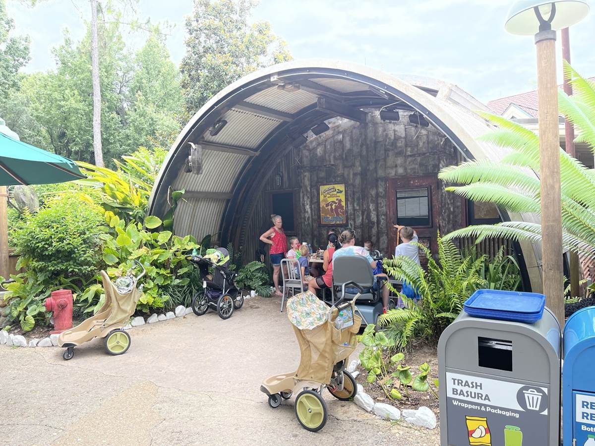 As we entered the land we realized that there are some changes afoot at The Boneyard. While the land’s playground and fossil dig have been closed to guests since the parks reopened last July, the attraction was never covered up as it is today. Where once ropes and a cast member or two once protected the area from curious guests, now sits a wall of moveable planter boxes barricading the area.