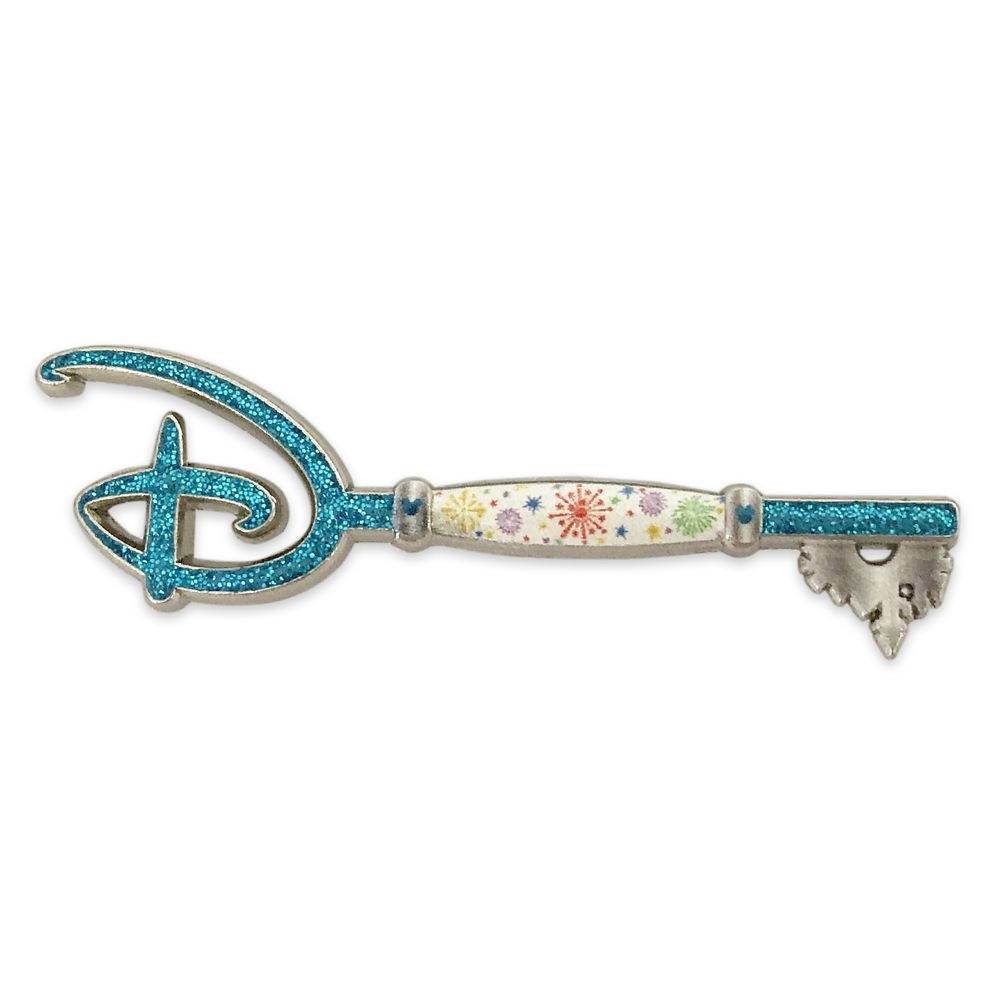 - The collectible Fireworks Key Pin features a signature “D” decorated with blue sparkles that looks just like a starry sky. The center of the pin is a white background covered in colorful fireworks of various sizes.