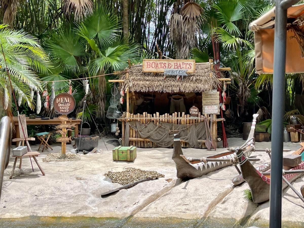 New theming has been added to this beach, where canoes are now available for rent. It’s no longer a welcoming hut full of dancing “pygmy people.” Skulls on stakes have also been removed from this scene and all others.