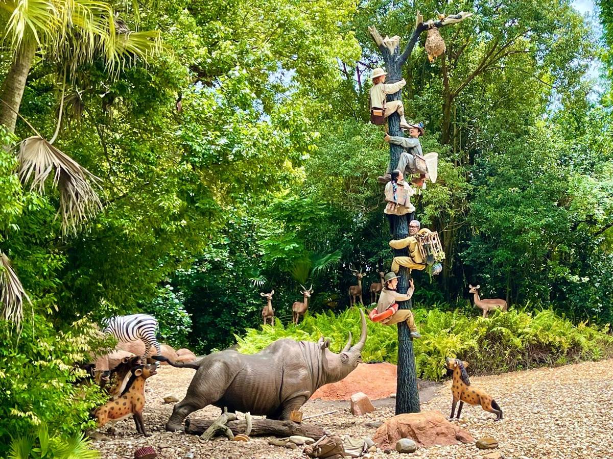 The safari crew was changed last month, as previously shared on Instagram by the official Walt Disney Imagineering account. Folded into a new storyline, the explorer on the bottom of the pole closest to the rhino is Felix Pechman XIII, a new skipper with the Jungle Navigation Company who had some bad luck on his first safari with VIPs in tow. The top of the pole also has a new bird's nest.