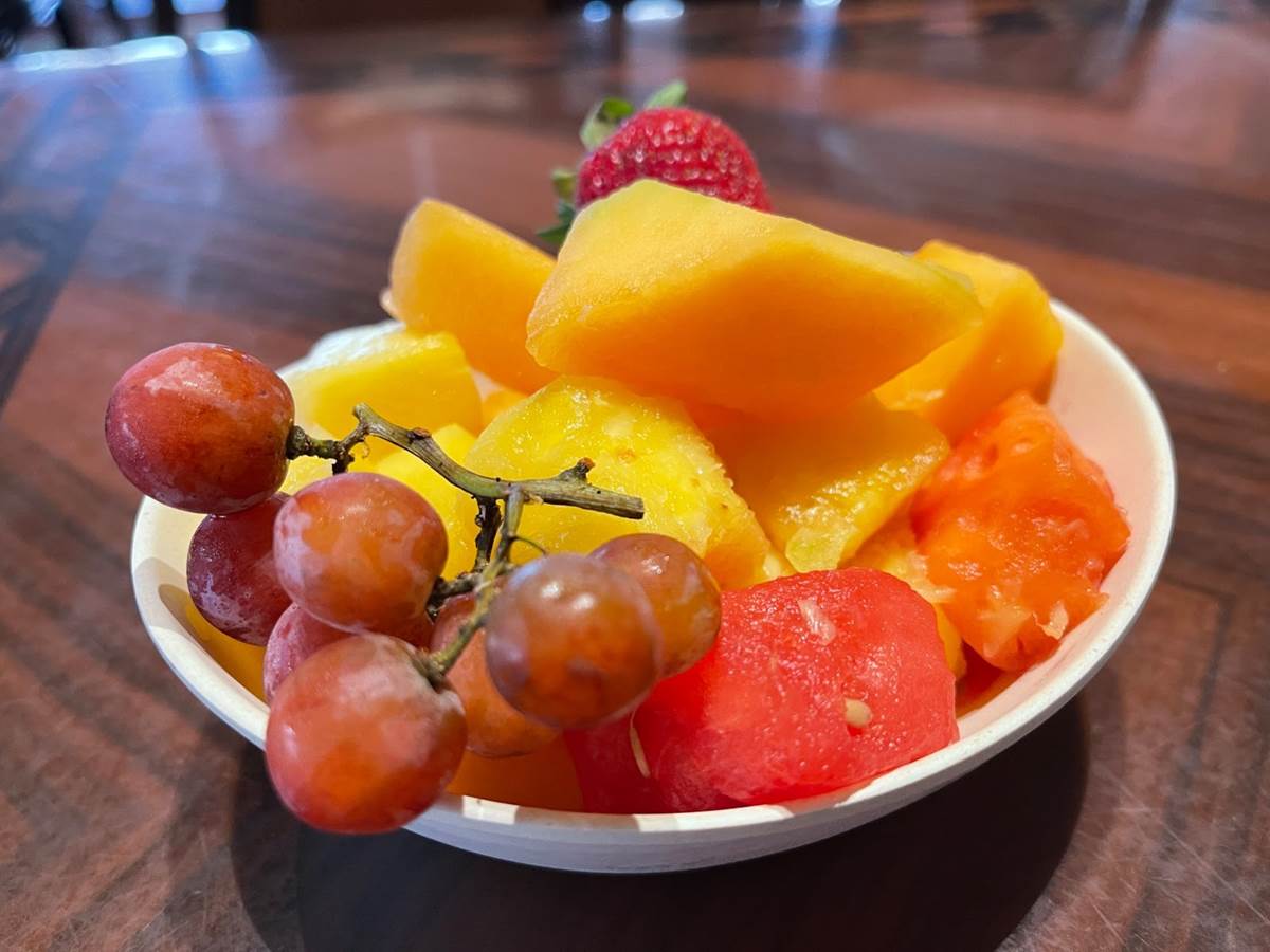 - Starting off with some POG juice, seasonal fruit, and pineapple-coconut breakfast bread.