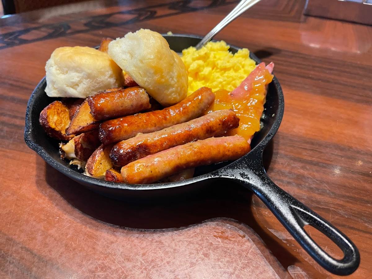 - Soon after, the main course will come, the ‘Ohana breakfast skillet which features scrambled eggs, pork sausage links, Hawaiian-style ham topped with pineapple compote, fried island-style potatoes, mickey-shaped waffles, and biscuits.
