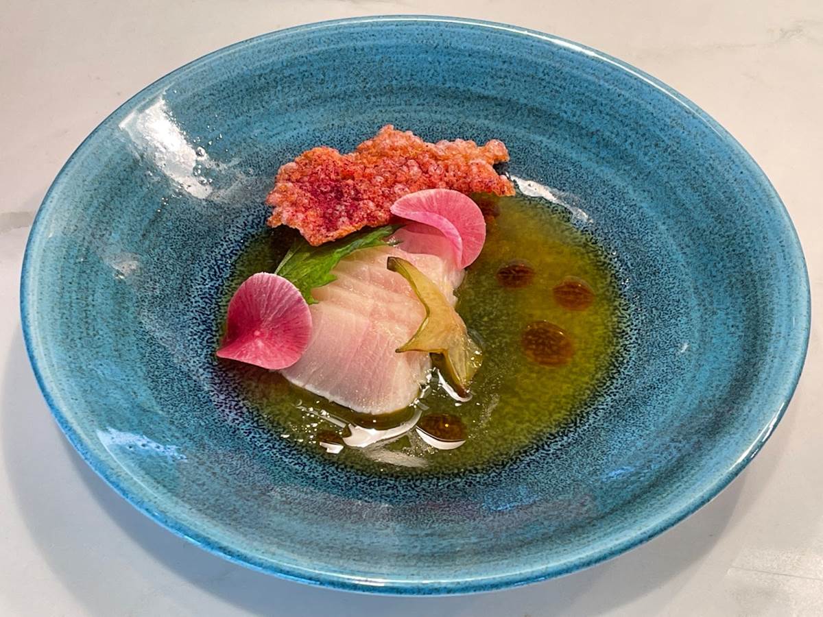 Citrus-cured Hamachi has passion fruit nuoc cham, star fruit, pasilla oil, and blood orange puffed tapioca.