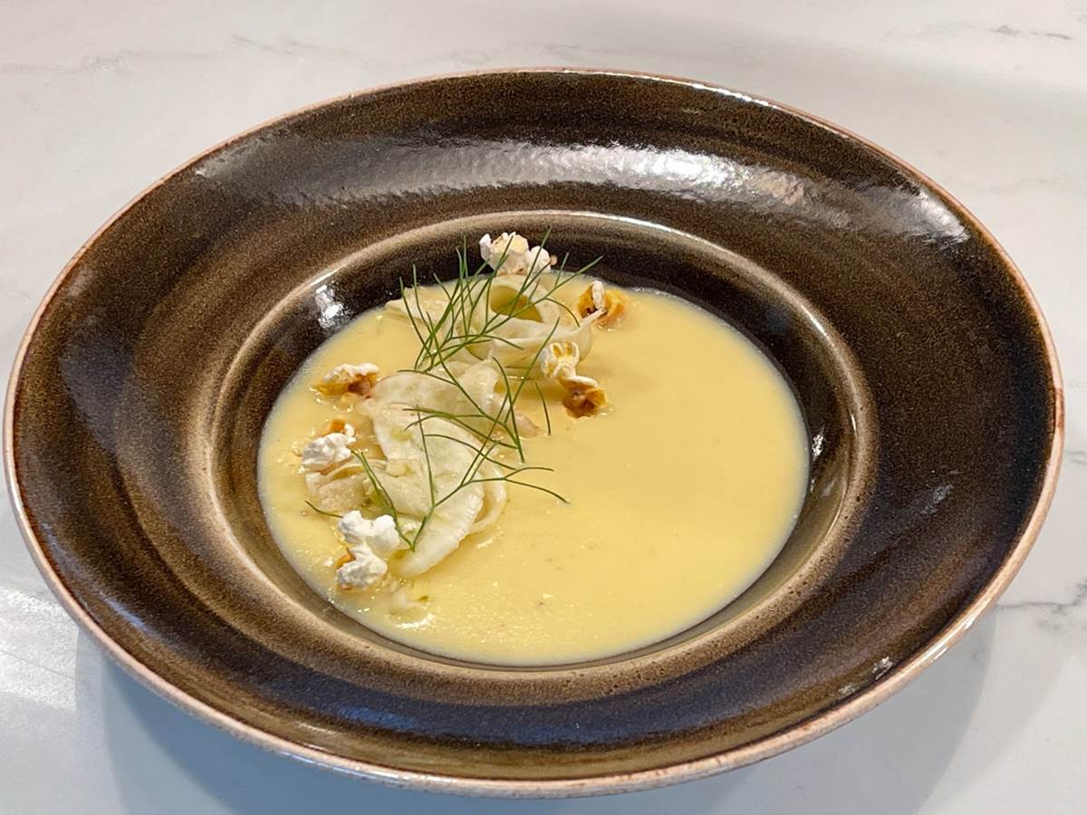 The sweet corn bisque comes with popcorn on top, pickled fennel, and fennel oil served table side.