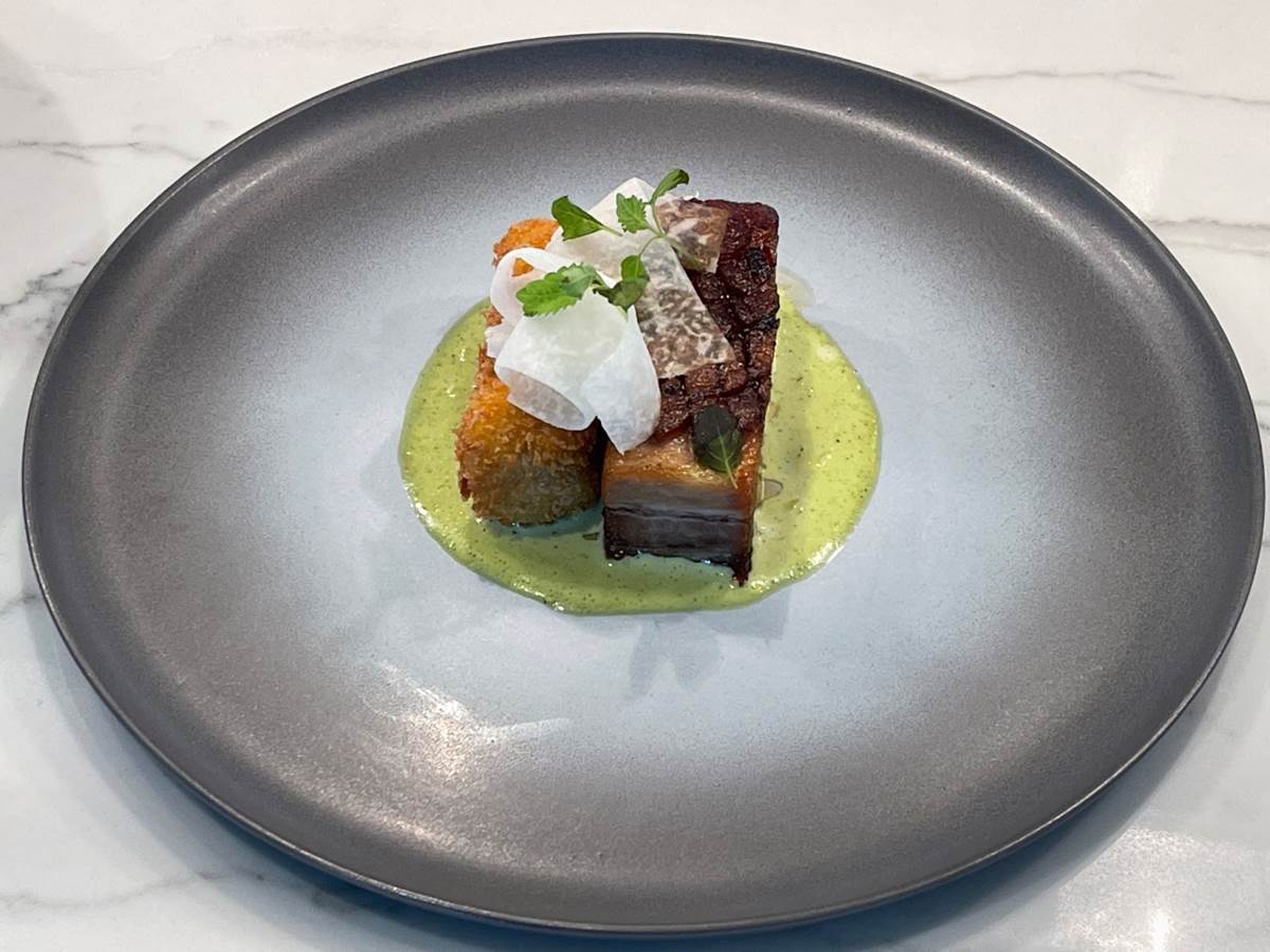 Berkshire pork belly is braised for 8 hours and includes boniato and plantain croquette, salsa verde, and jícama.