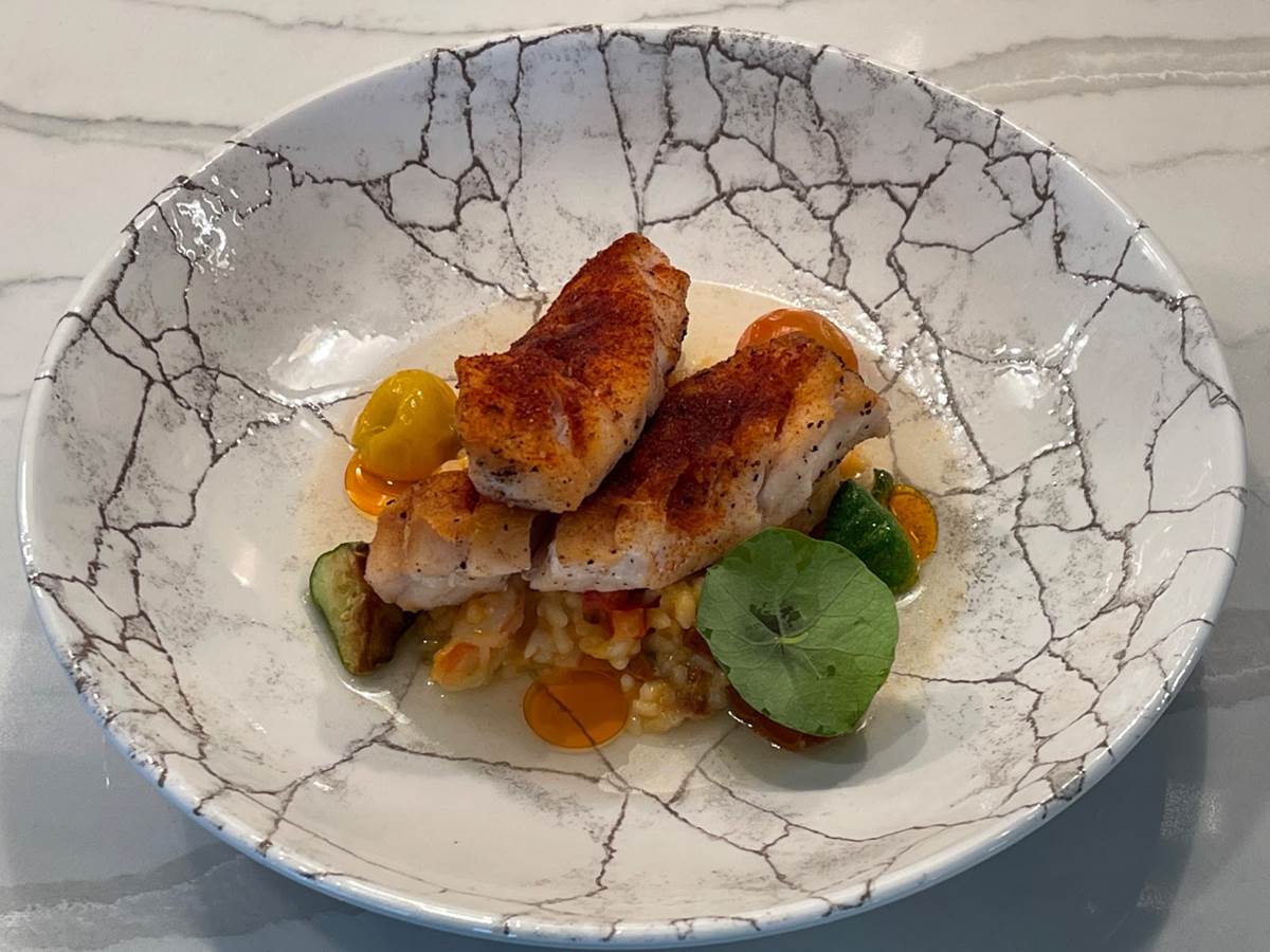 Golden tilefish has jupiter rice chorizo “risotto,” and confit tomatoes.