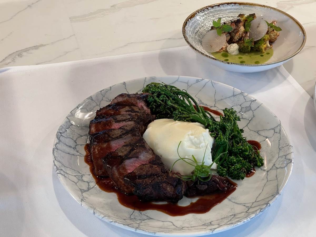 The 12-oz New York strip comes with a vegetable purée, broccolini, cipollini jam, and Bordelaise.